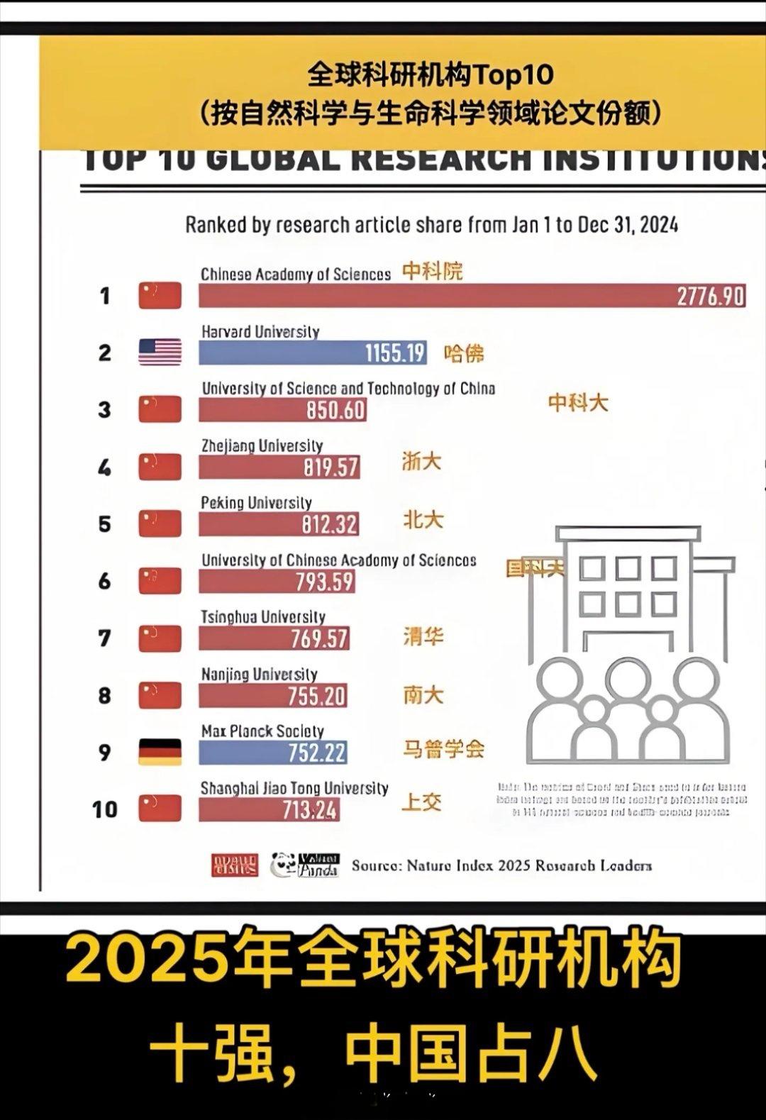 2025年全球科研机构十强,中国占据八席!根据自然指数(NatureIndex