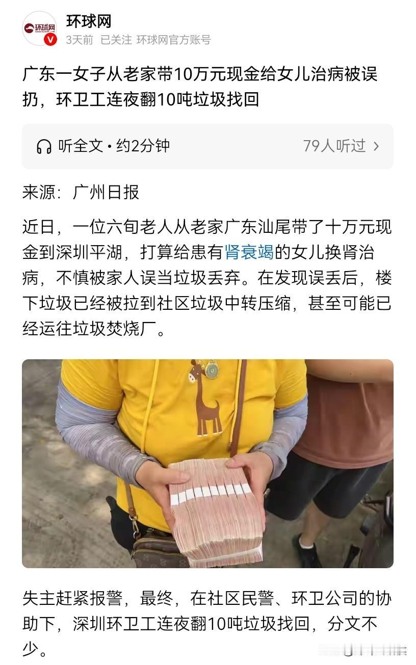 居然还有如此马大哈的姐姐! 妹妹10万元的救命钱,却被姐姐丢进了楼下的垃圾桶,等到发现时已经后悔莫及。 近日,广州日报报道了一起让人哭笑不得的新闻。 一位老人的小女儿因为肾衰竭,急需要换肾,特意从老家带来了10万现金,一路上为了以防万一,用厚厚的塑料袋装着。 而这10万无钱,就是为即将到来的手术准备的。 况且这钱来得非常不容易,不仅是老人今年在乡下卖猪的钱,还包括从亲戚朋友那里借的。 为什么要带这10万元现金,而不是存进银行卡,这其中还闹出了一个大乌龙。 原来老人的银行卡因为转账限额卡在了5万元,因为怕耽搁事,所以就没有把钱存银行,而是直接带现金过来了。 如果没有大女儿的荒唐操作,老人也不会这么生气。 钱是用塑料袋装的,老人的大女儿不知怎的却把它当成了垃圾,直接丢进了垃圾袋,还特意跑到楼下扔进了垃圾桶里。 等到发现时,一家人全部下来去垃圾桶里翻找,然而就是没有找到,意识到钱已经丢了,老人当机立断报警了。 在警方的协调下,事件终于有了转机。 要知道如果再晚10分钟,清运车就会把垃圾运送到压缩站了,等那时再去找,无异于大海捞针。 功夫不负有心人,最终经过了11个小时左右的努力,工作人员才把钱给找到了,并安全送到了老人手中。 钱找到了,手术可以做了,这已经是不幸中万幸,只不过这位大女儿能把10万元当垃圾扔了,这马大哈的习惯,估计要改一改了。