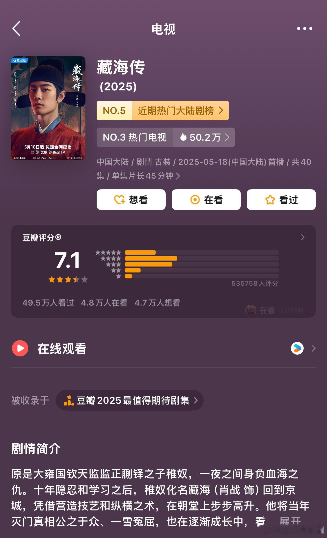 《藏海传》开分7.1万超31.2万人打分,目前播出4个多月评分稳定在7.1分超53.5万人参与打分