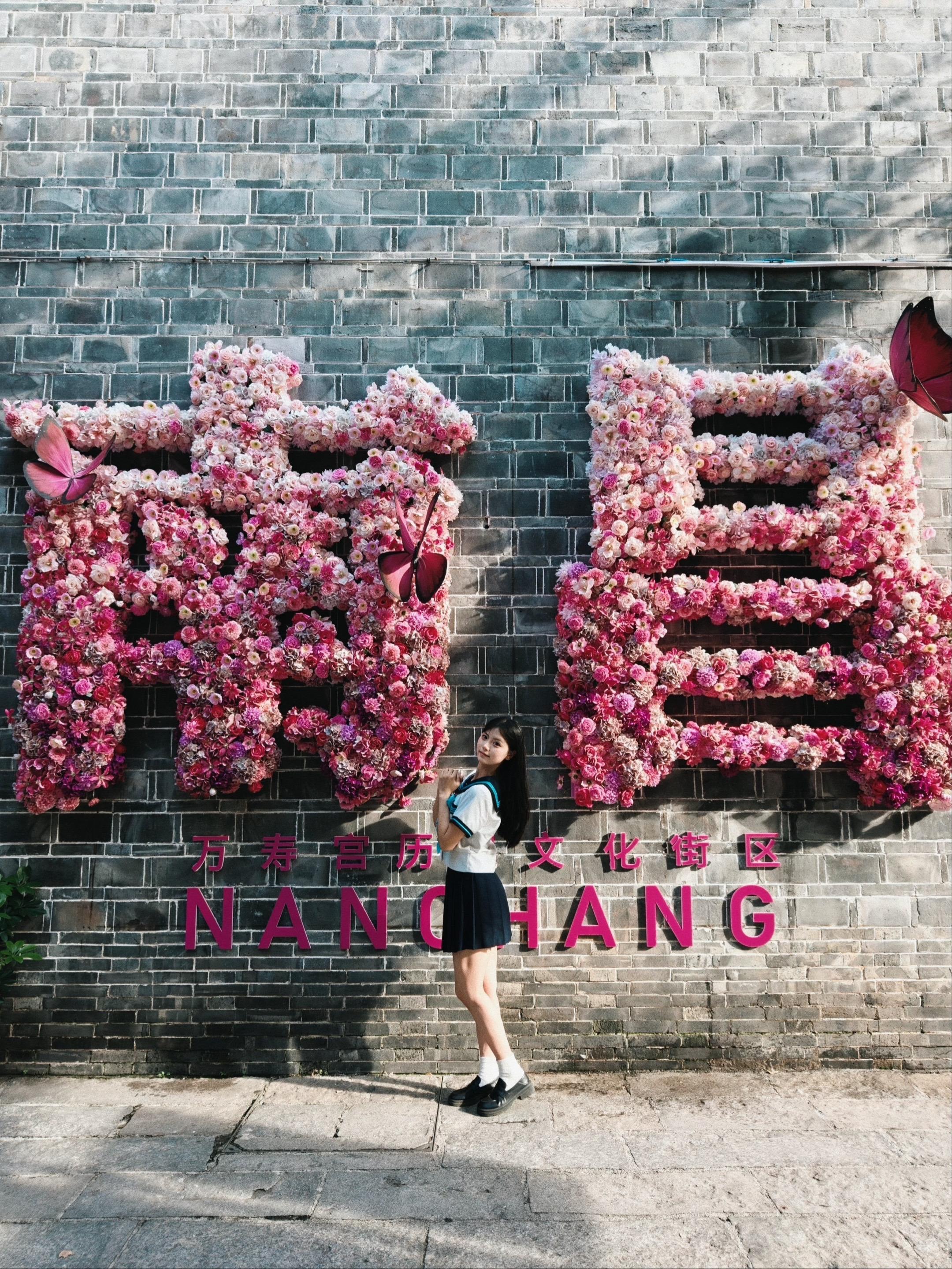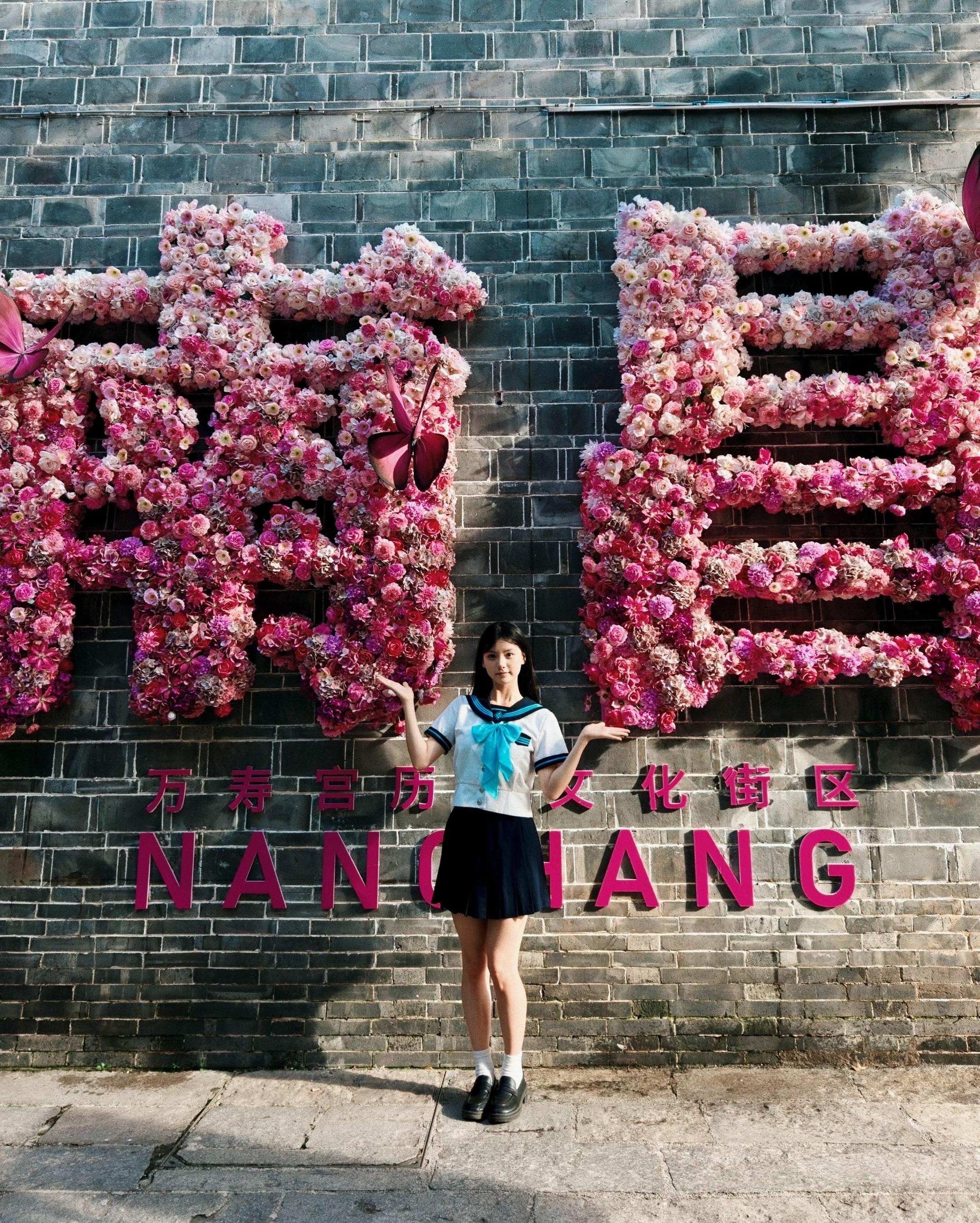 - 可以让模特在花墙下面用双手拖着南昌拍一张