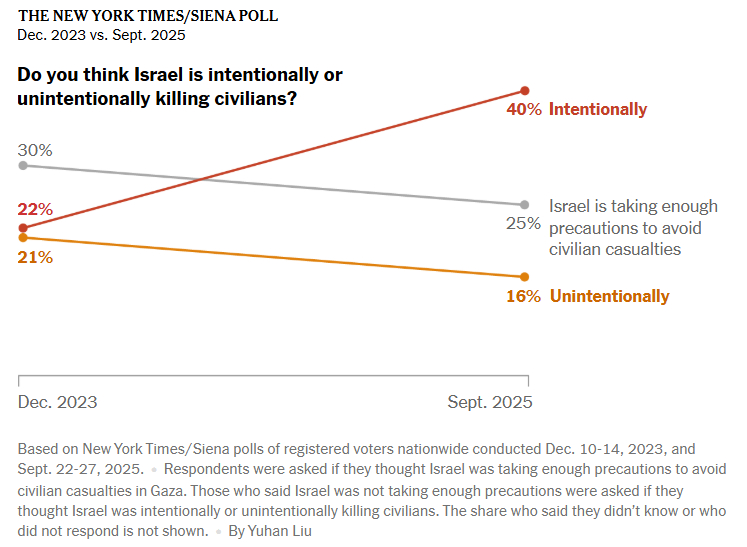 还有40%的选民认为,以色列在加沙是“蓄意杀害平民”,这个比例几乎是2023年同类调查中认同这一说法人数的两倍。