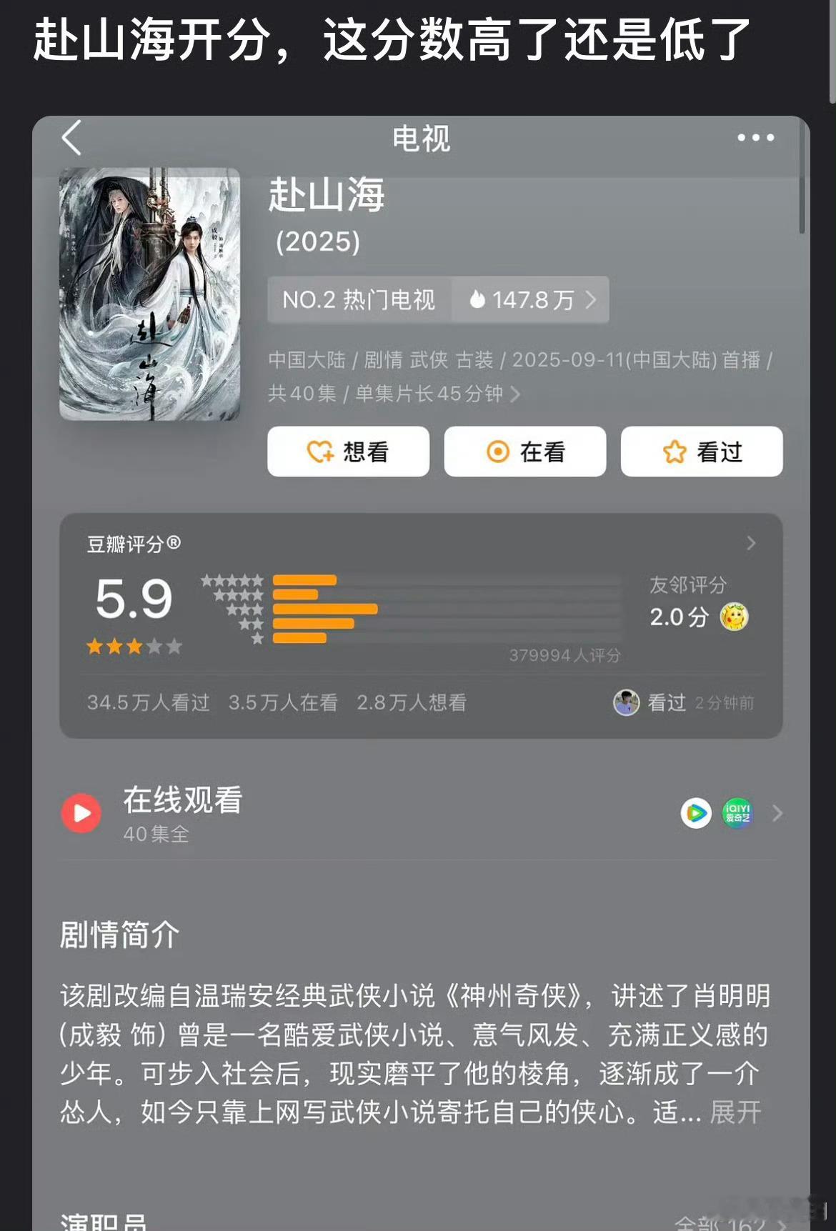 成毅主演赴山海豆瓣开分5.938w人打分这分高了低了?