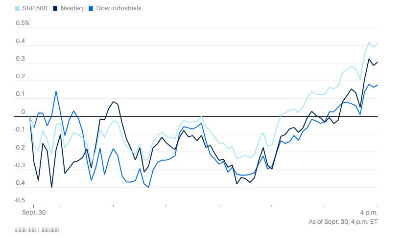 美股周五尾盘大幅反弹,为十多年来表现最好的九月画上句号。道琼斯工业平均指数上涨82点,涨幅0.2%,创下收盘新高。标普500指数上涨0.4%,纳斯达克综合指数上涨0.3%。标普和纳指都是自2010年以来表现最强劲的九月,标普指数也实现了连续第五个月上涨。