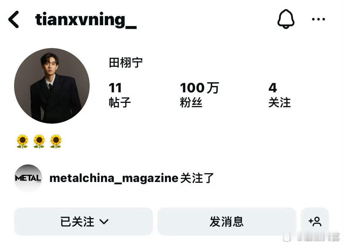 田栩宁ins粉丝数破100万田栩宁ins粉丝数破百万田栩宁ins粉丝数破100