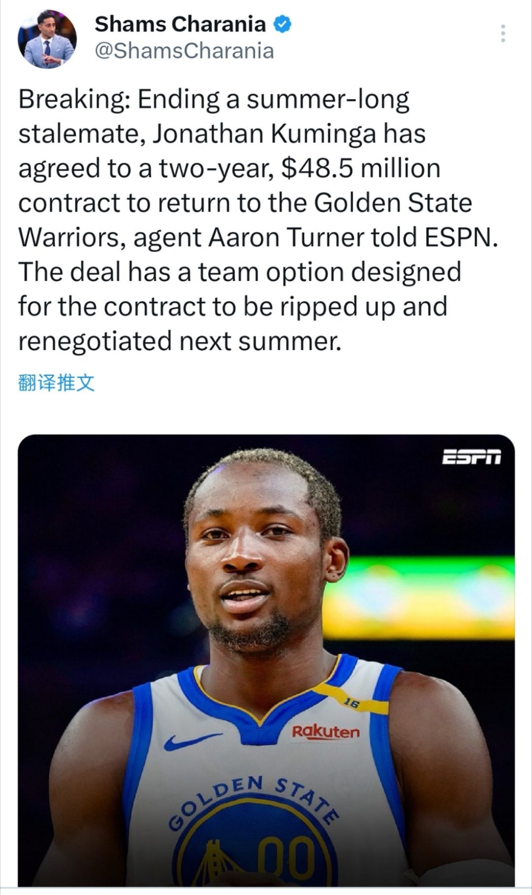 ☞撕逼大戏结束,Shams:库明加2年4850万美元续约勇士,第二年球队选项