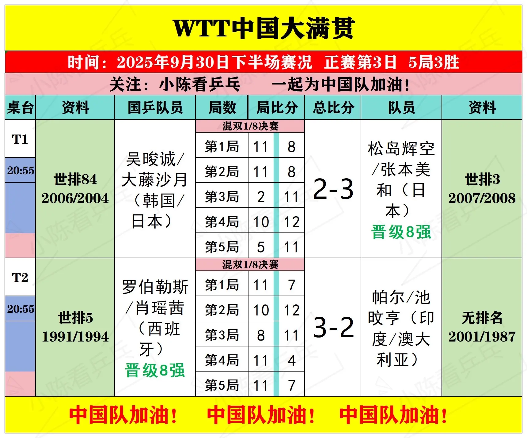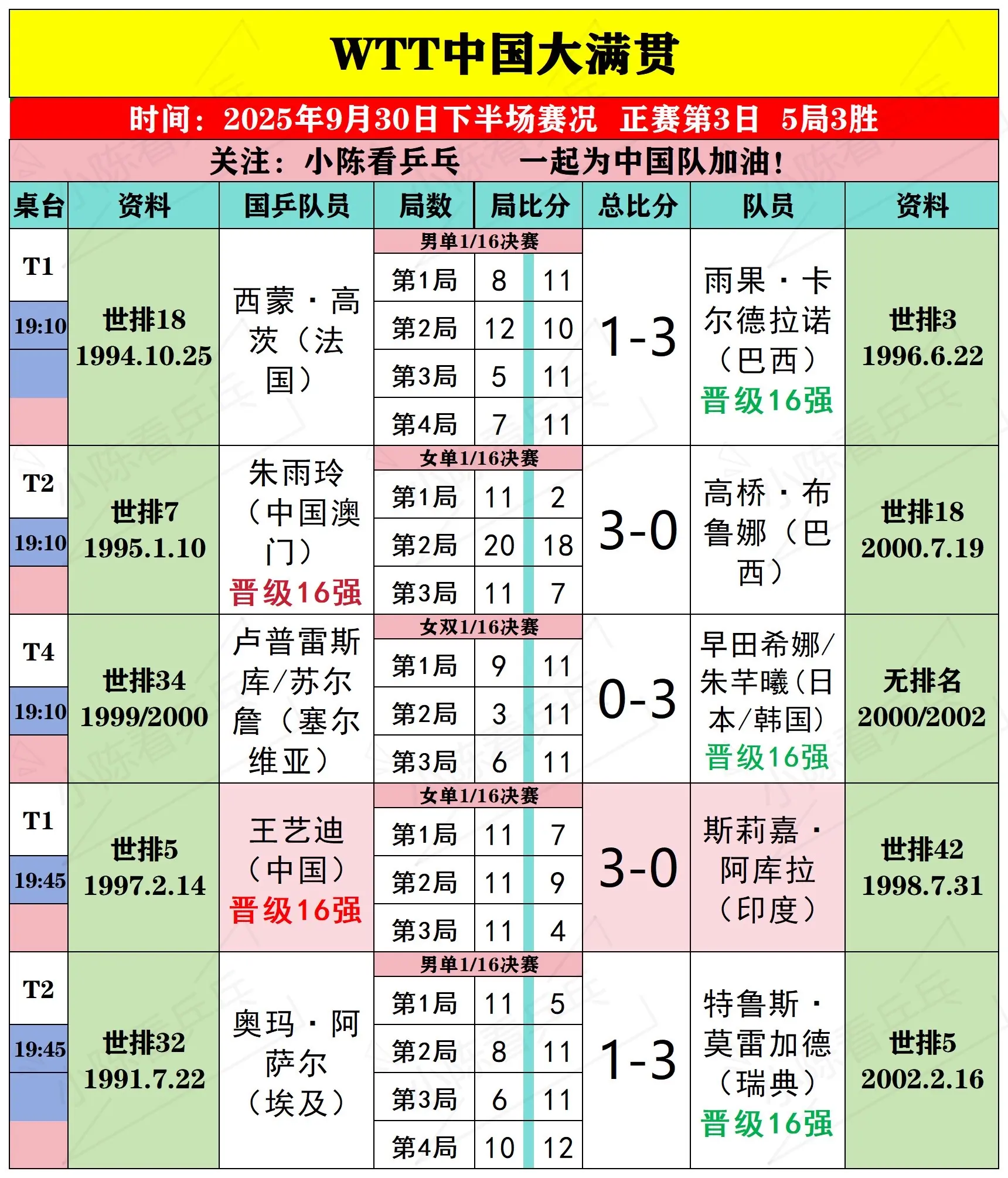 WTT中国大满贯#最新战报北京时间9月30日,2025WTT中国大满贯展开一