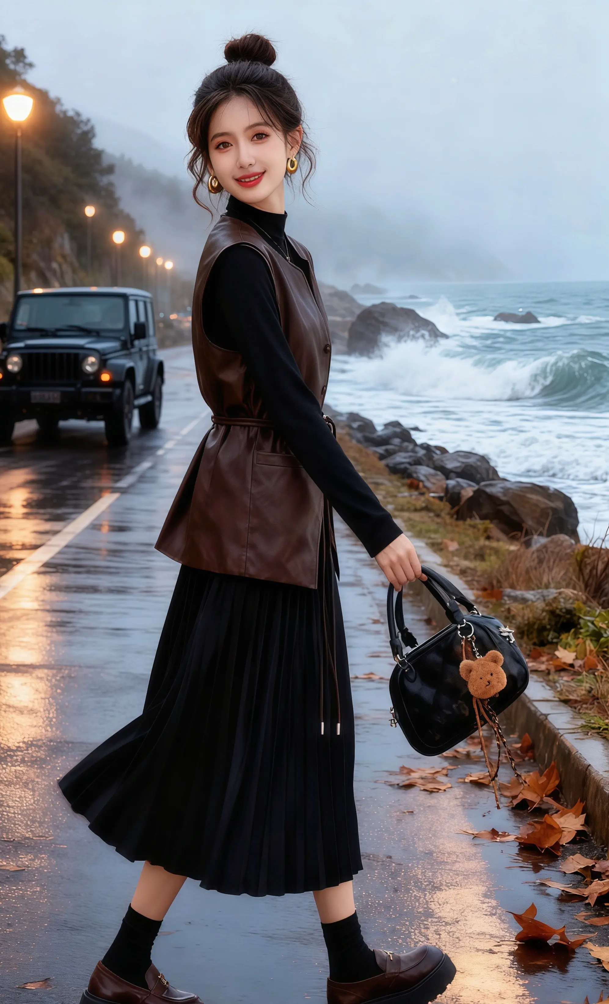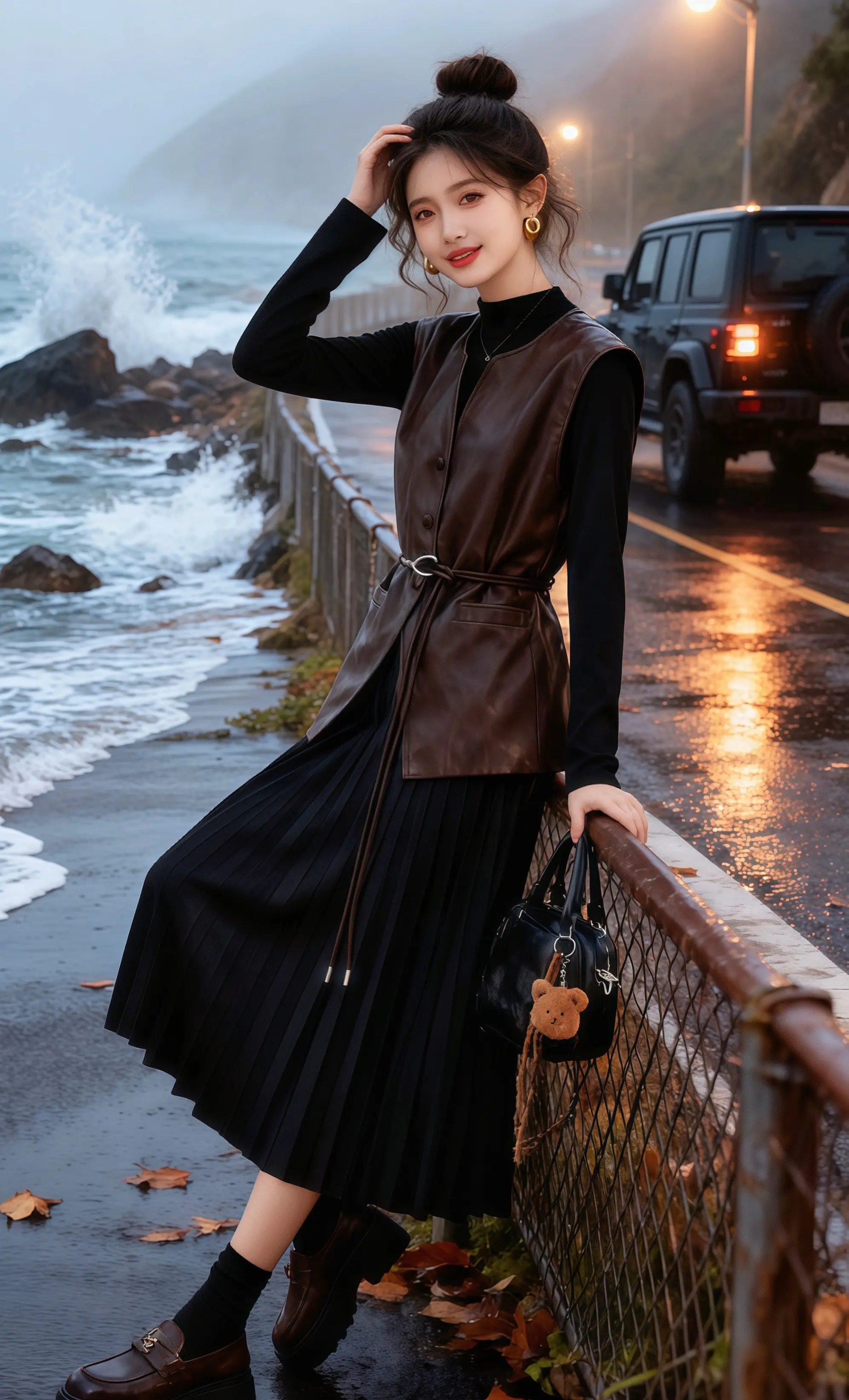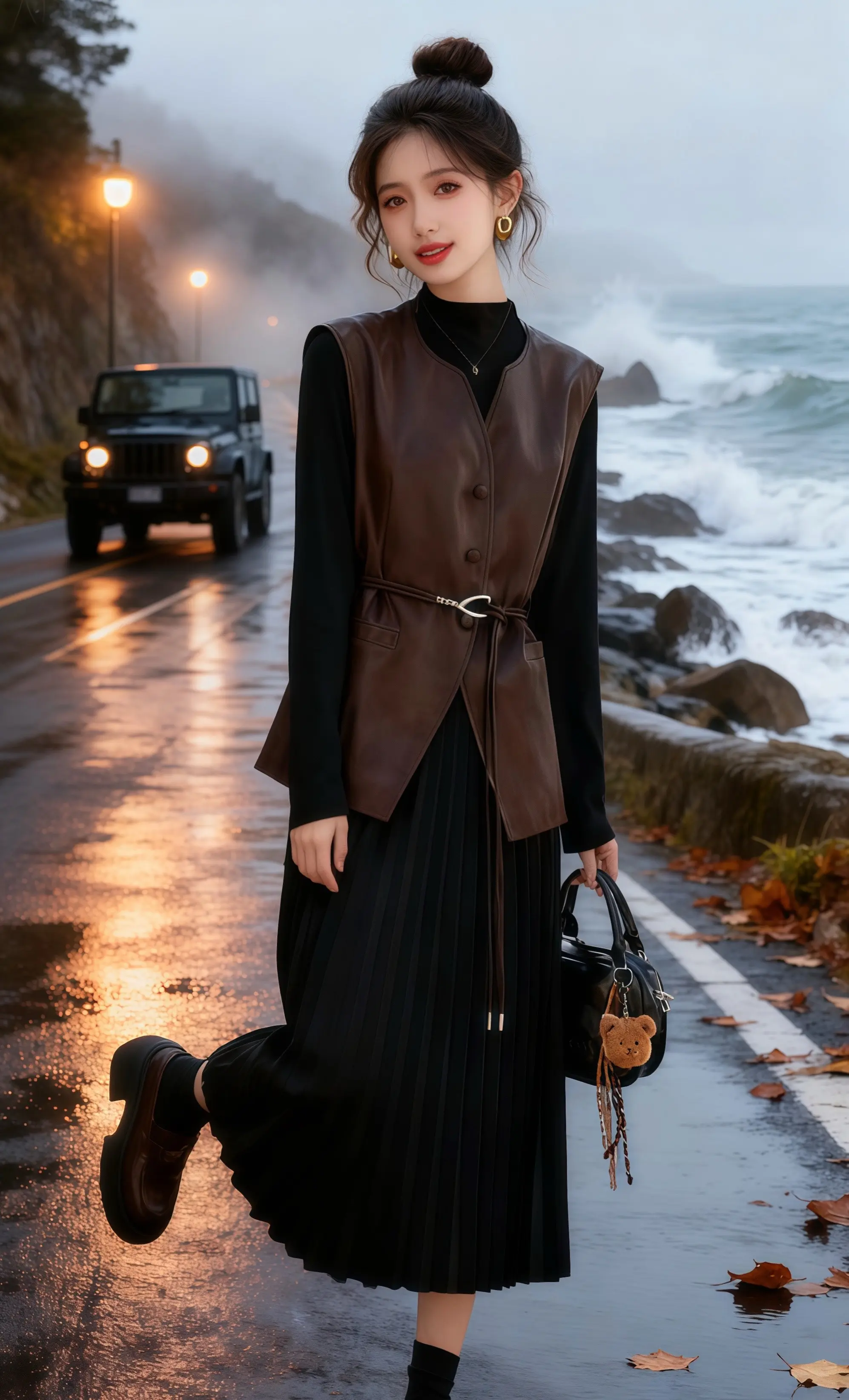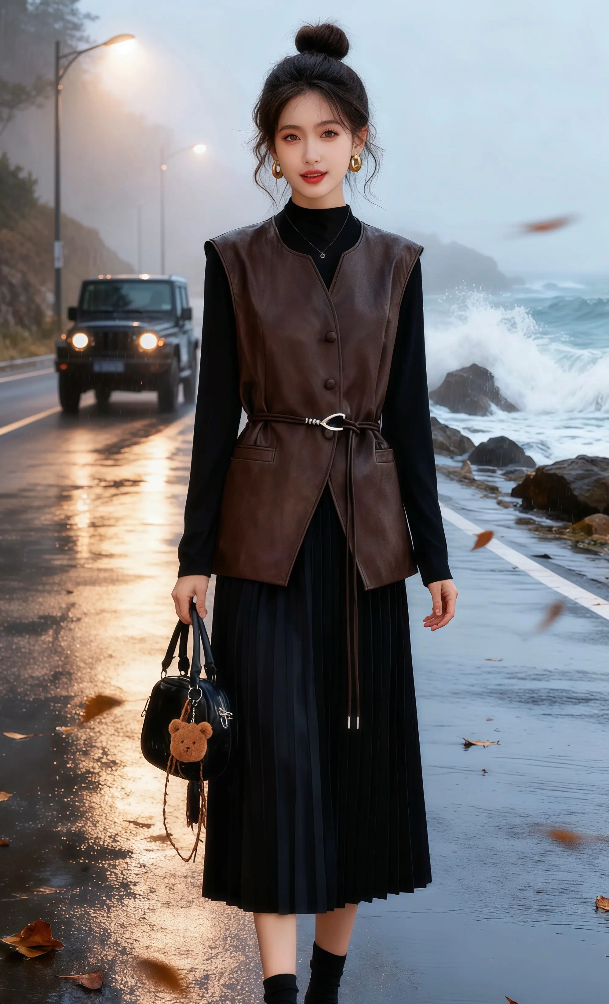 雨后的沿海公路还氤氲着雾气,林晚踩着湿漉漉的路面,棕色皮马甲被海风吹得微微晃动。她刚结束一场城市的喧嚣,驱车来到这片海岸,想让海浪声抚平心绪。