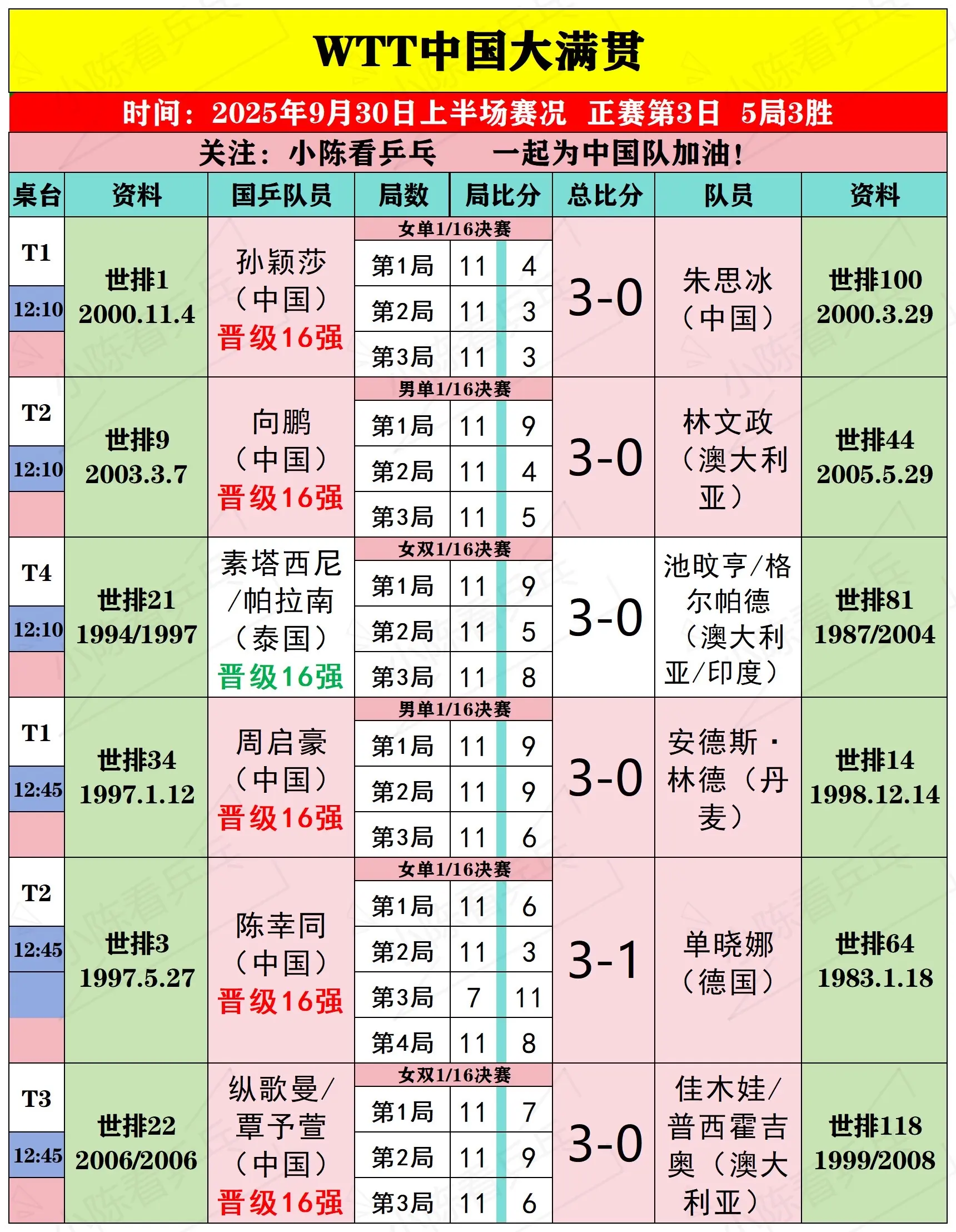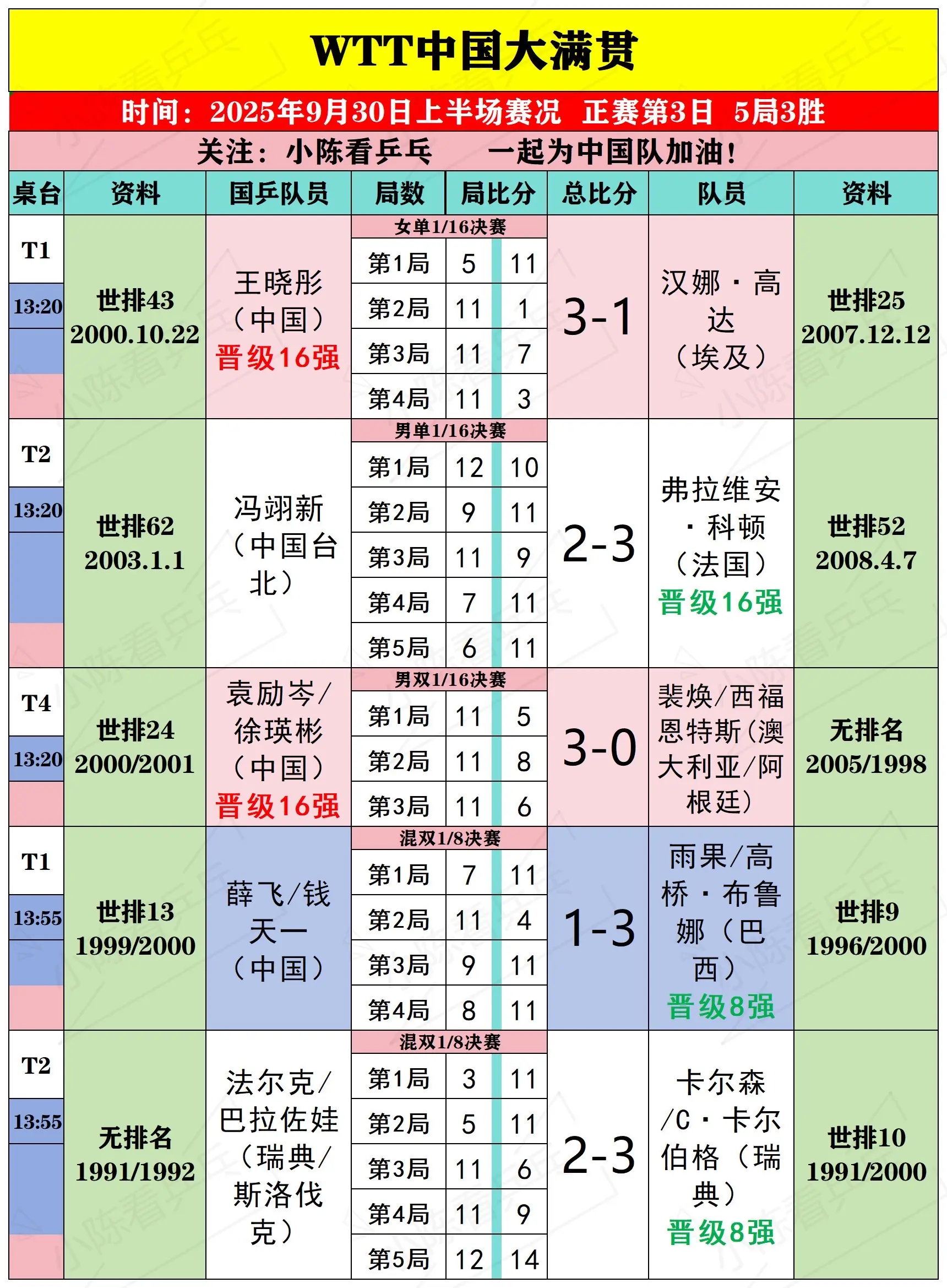 WTT中国大满贯9月30日上半场比赛结果。WTT中国大满贯9月30日上...