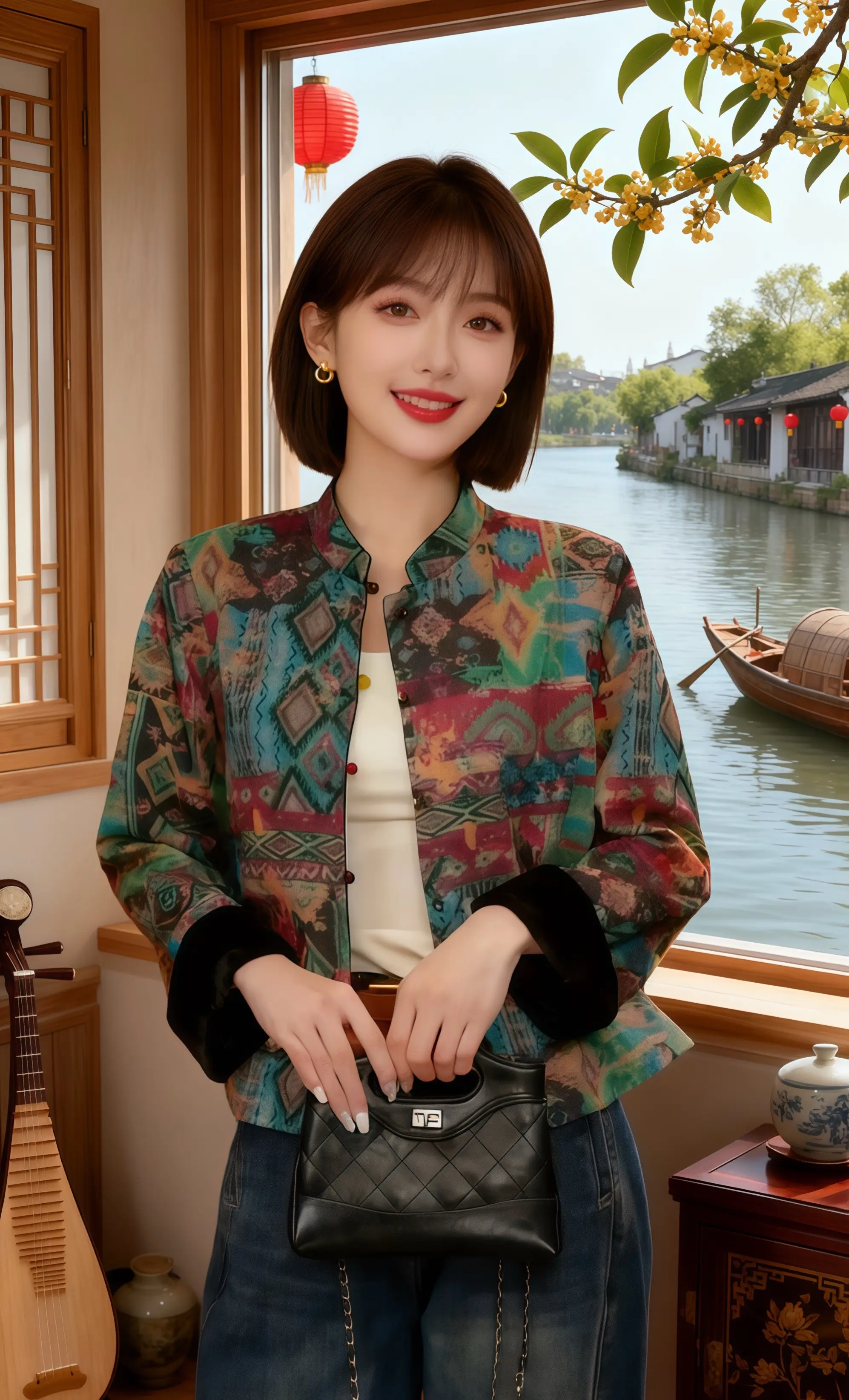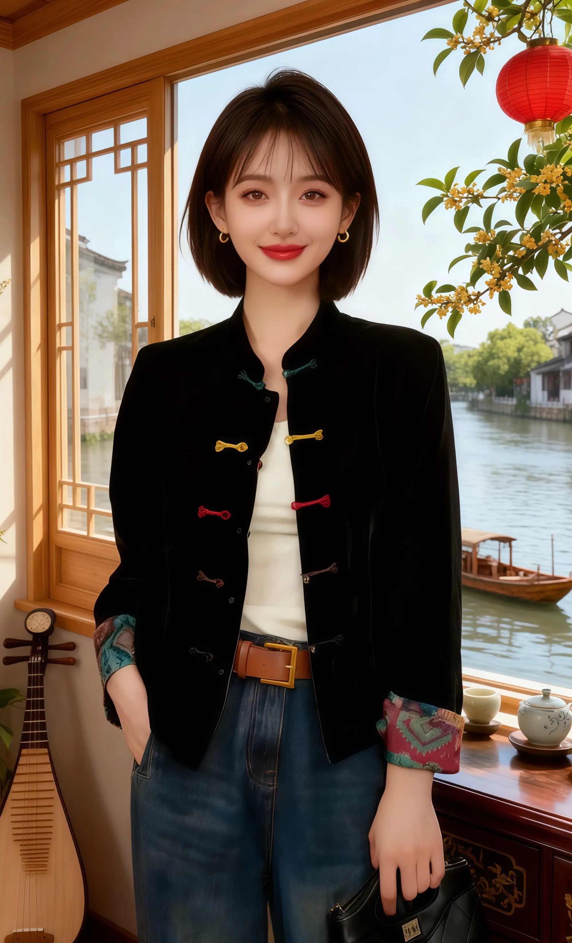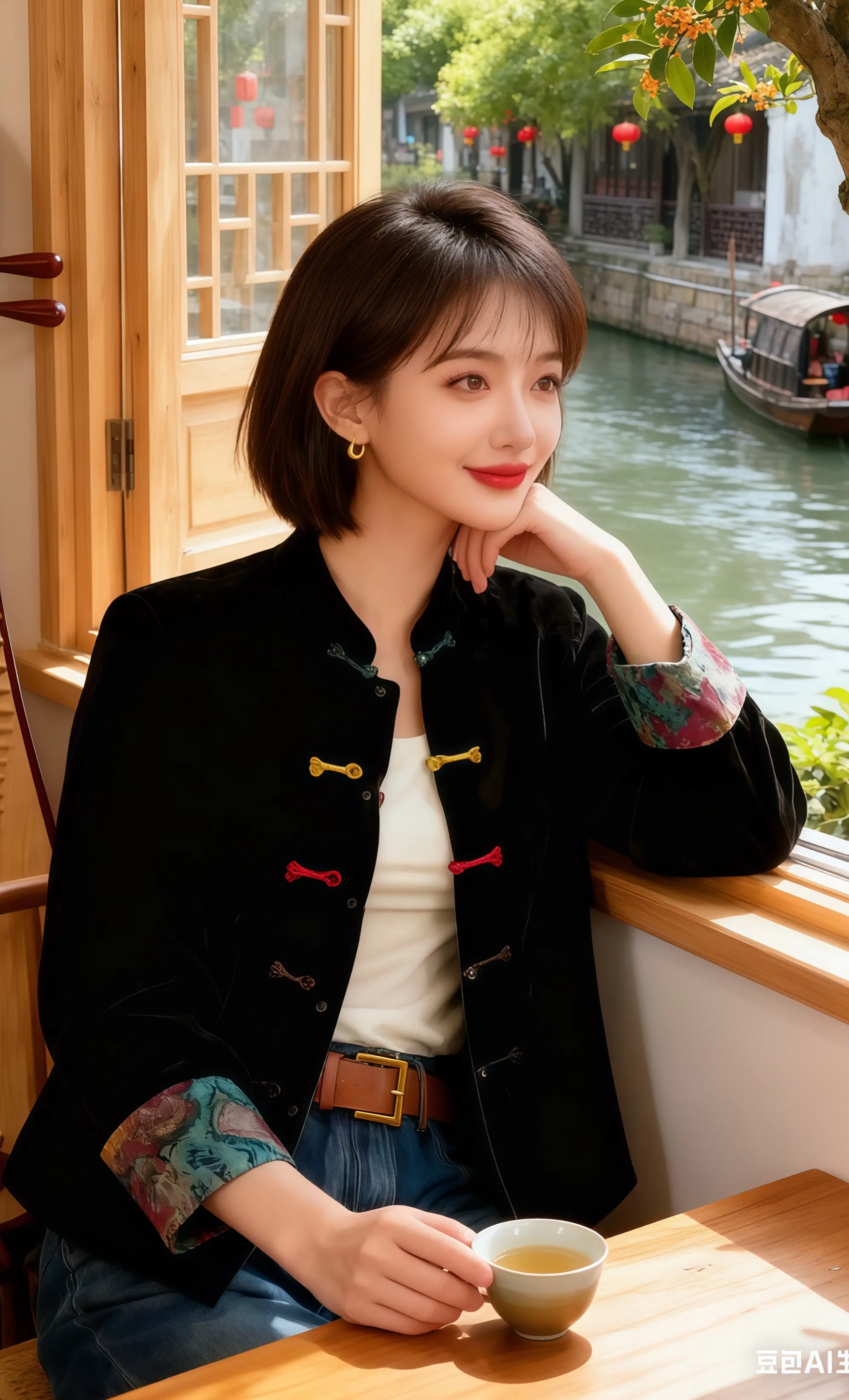 她端起茶杯,望向窗外的河道,乌篷船悠悠划过,红灯笼在风里轻晃。琵琶声偶然从邻院传来,和着桂花香,让她想起为设计这款服饰,在水乡采风的日日夜夜——那些古桥、那些老巷,都成了布料上的灵感印记。