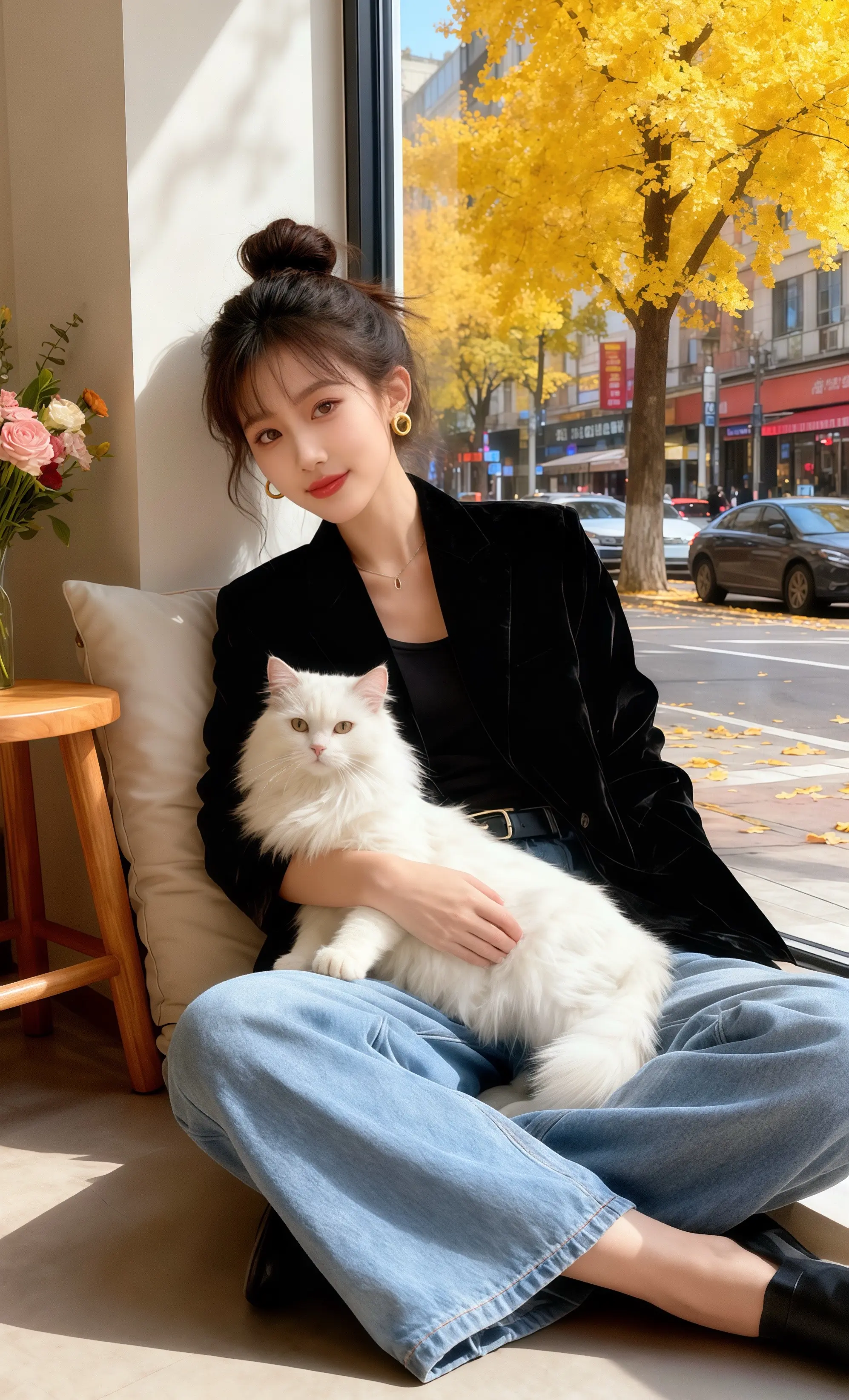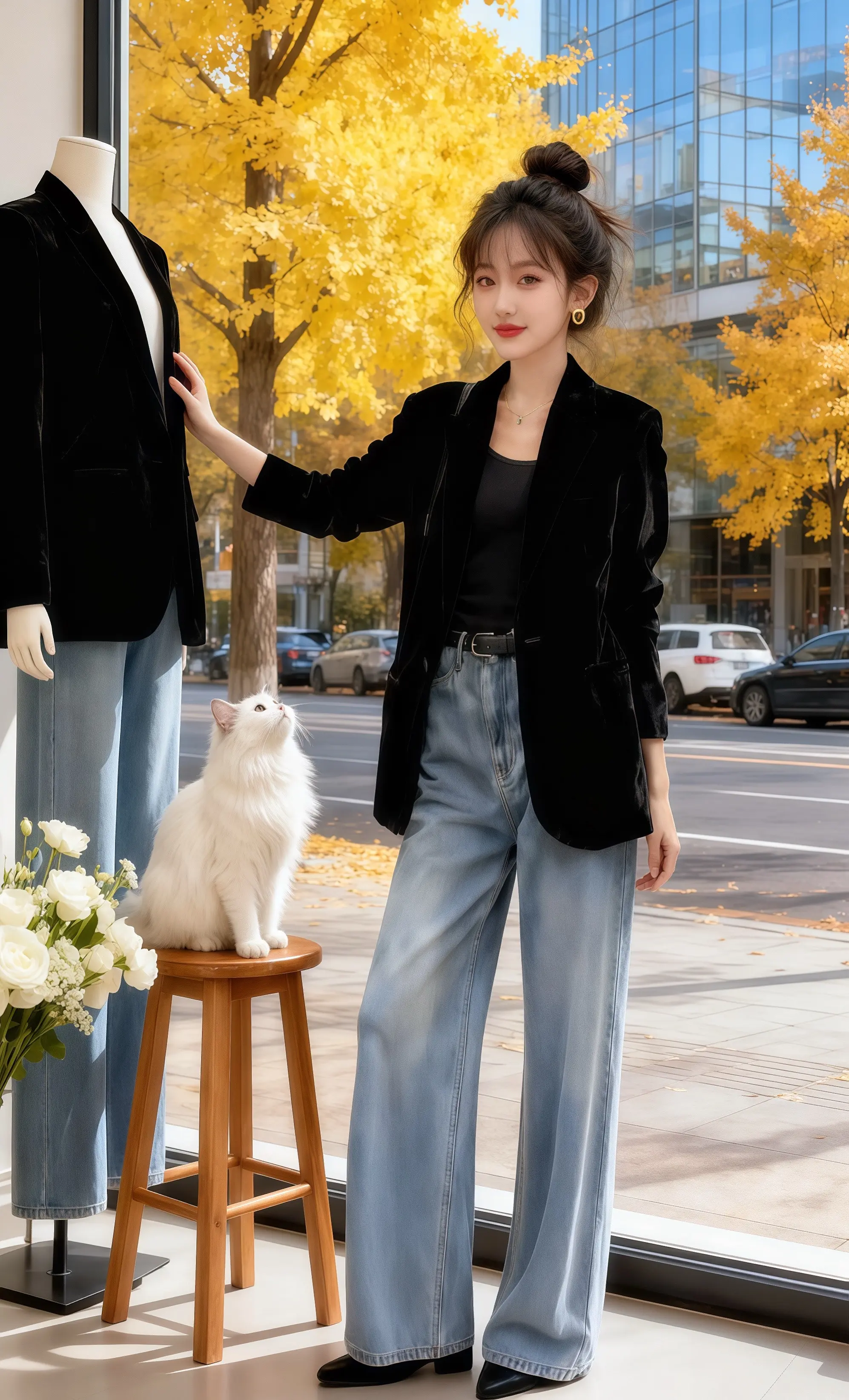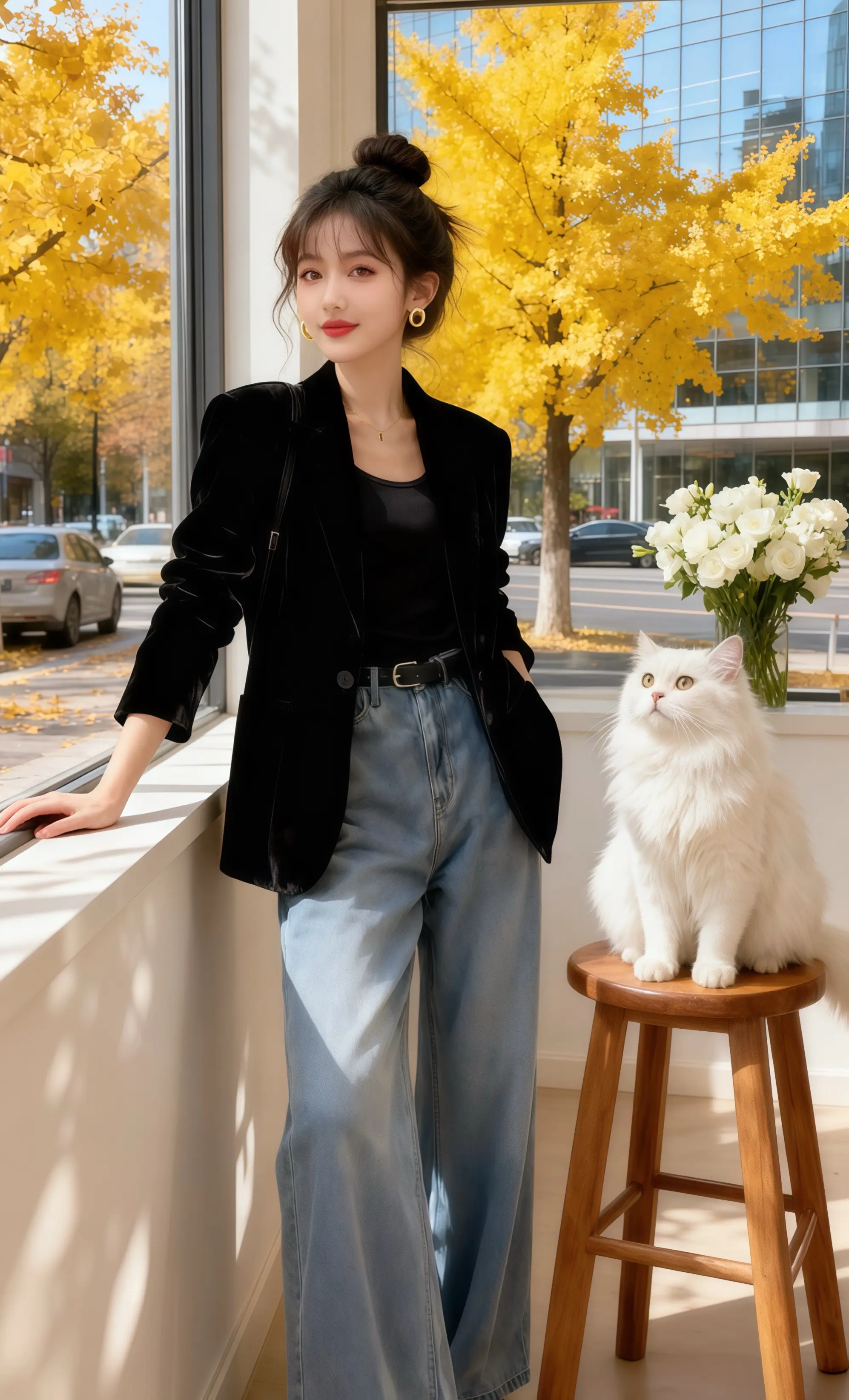 她靠在窗边,看街上车水马龙,看银杏叶打着旋儿飘落。这套穿搭是她的心头好,丝绒的复古与牛仔的随性碰撞,就像她的小店,在都市喧嚣里守着一处温柔角落。而云朵的陪伴,让每一次穿搭展示都成了治愈的日常——原来好的穿搭和可爱的生命一样,都能把平凡的秋日,变成闪闪发光的时光。