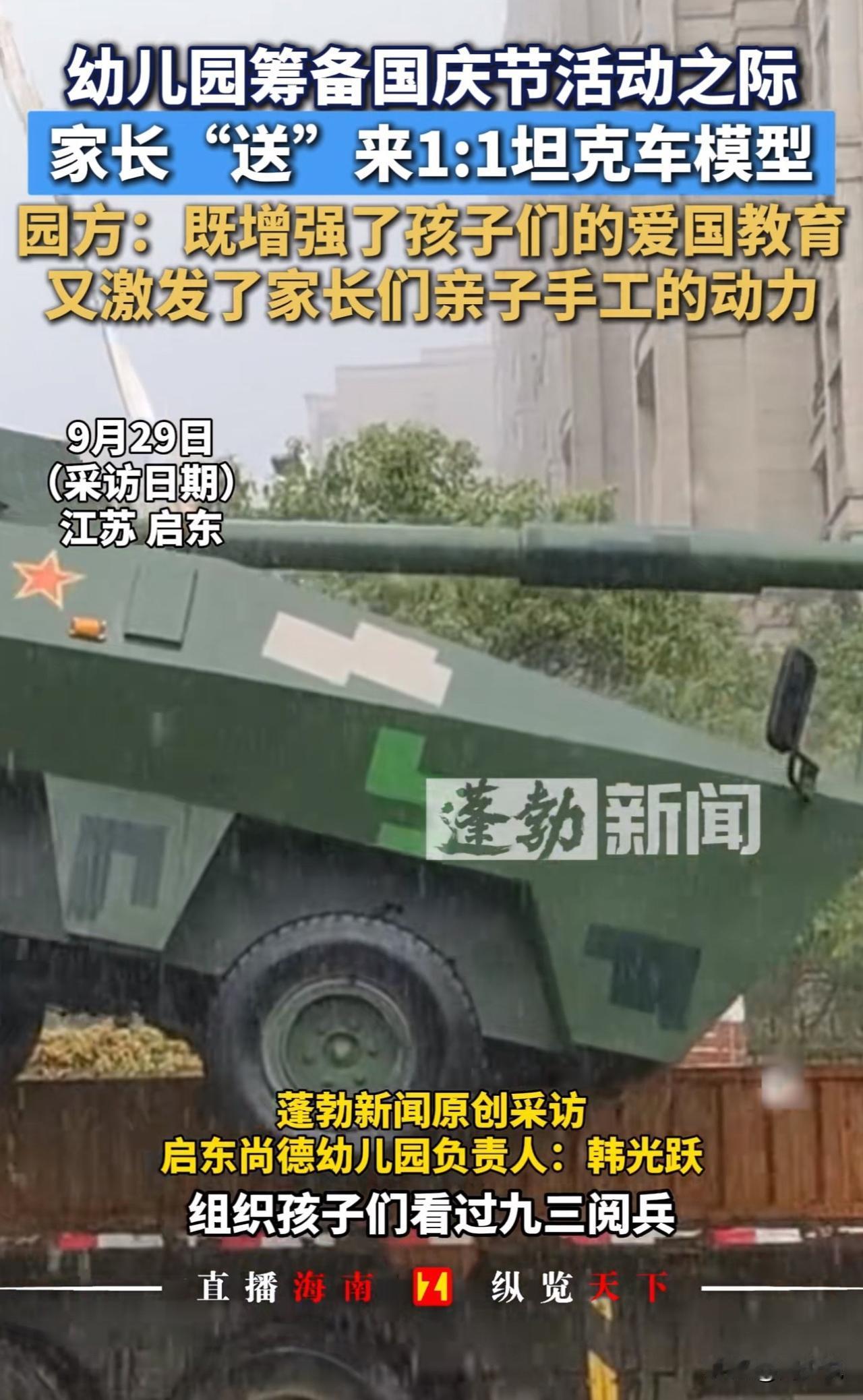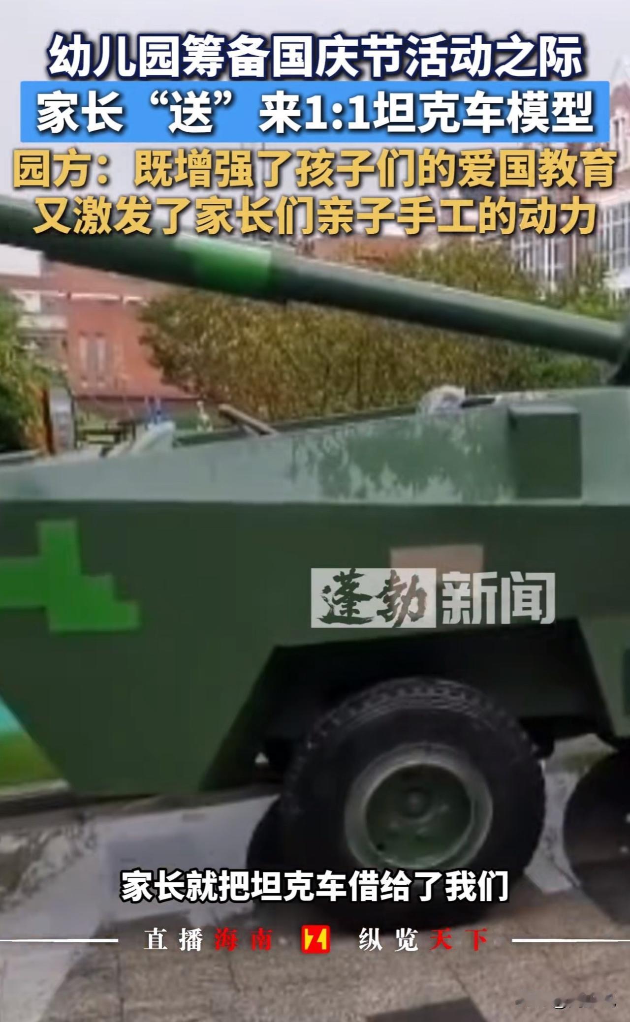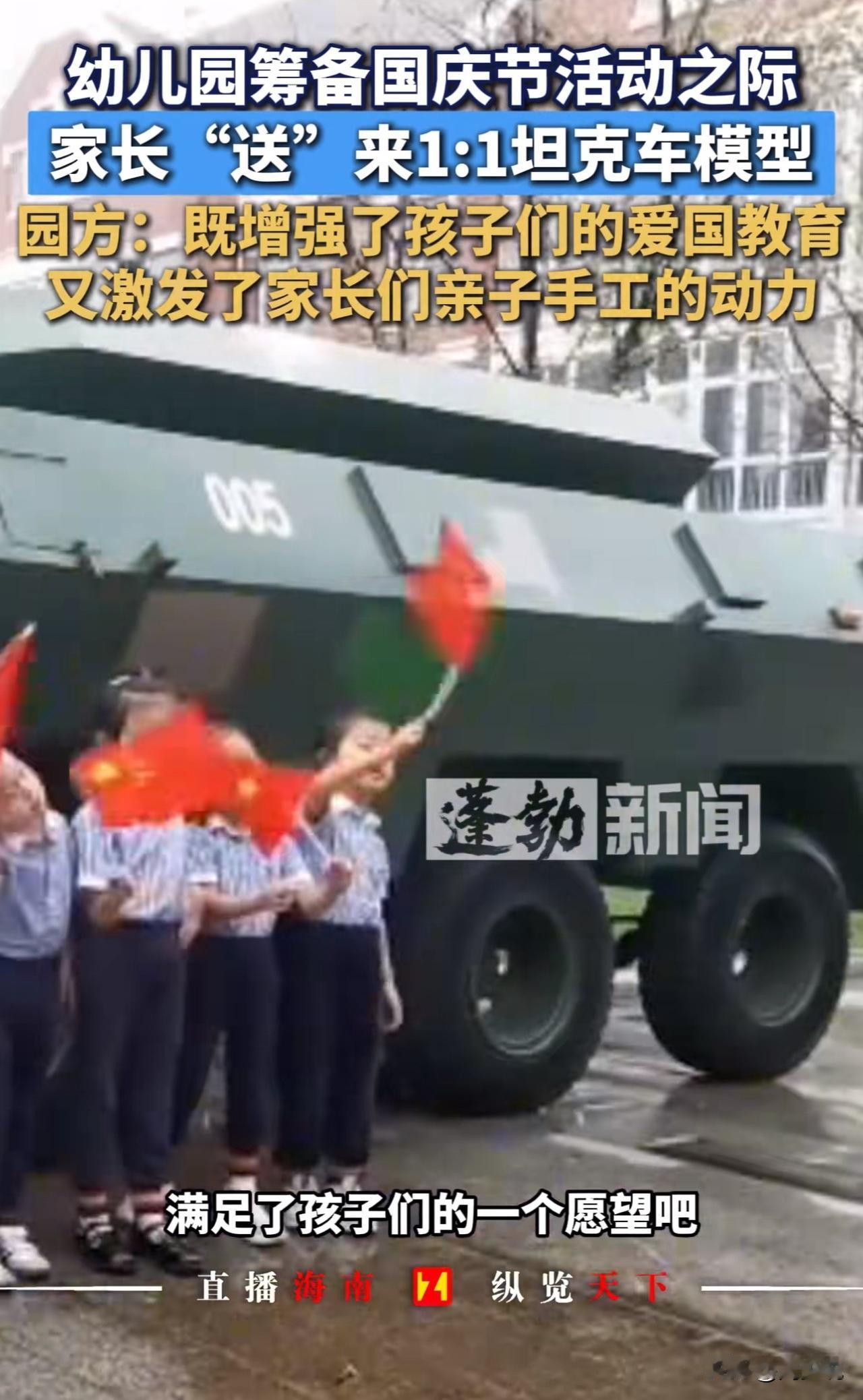 “真硬核!”近日江苏一幼儿园因一辆“坦克”走红,被网友戏称“最牛手工作业”。 原来,该园举办国庆活动时,一位开军旅研学营的家长,特意将1:1比例的战车模型借给幼儿园。 此前孩子们看九三阅兵视频后对武器兴趣浓厚,看到“坦克”后兴奋打卡、合影体验,毕业学子也专程赶来。园方称,“此举既圆了孩子心愿,也借此开展爱国主义教育,活动结束后模型已归还。” 此事情曝光后,网友热议:“这家长太硬核!”“沉浸式爱国教育太有意义”! 也有网友调侃,“这下家长群彻底卷起来了”。 看完这事儿,周少觉得这位家长的做法,其实是给教育者上了生动一课。 比起课本上的图片和视频,这种看得见、摸得着的实物体验,更能点燃孩子的兴趣。孩子们围着“坦克”探索的样子,正是好奇心和求知欲被激发的表现,这种沉浸式感受带来的爱国情怀,也比空洞说教更有感染力。 说到底,教育不该局限于课堂,生活中的点滴都能成为教材。关键是家长和老师要多留心孩子的兴趣点,用他们能接受的方式传递知识和价值观。 这样的“硬核”教育方式,你觉得值得推广吗?如果是你,会用什么特别的方式给孩子做启蒙?#长沙新朋友# #寻美三湘#