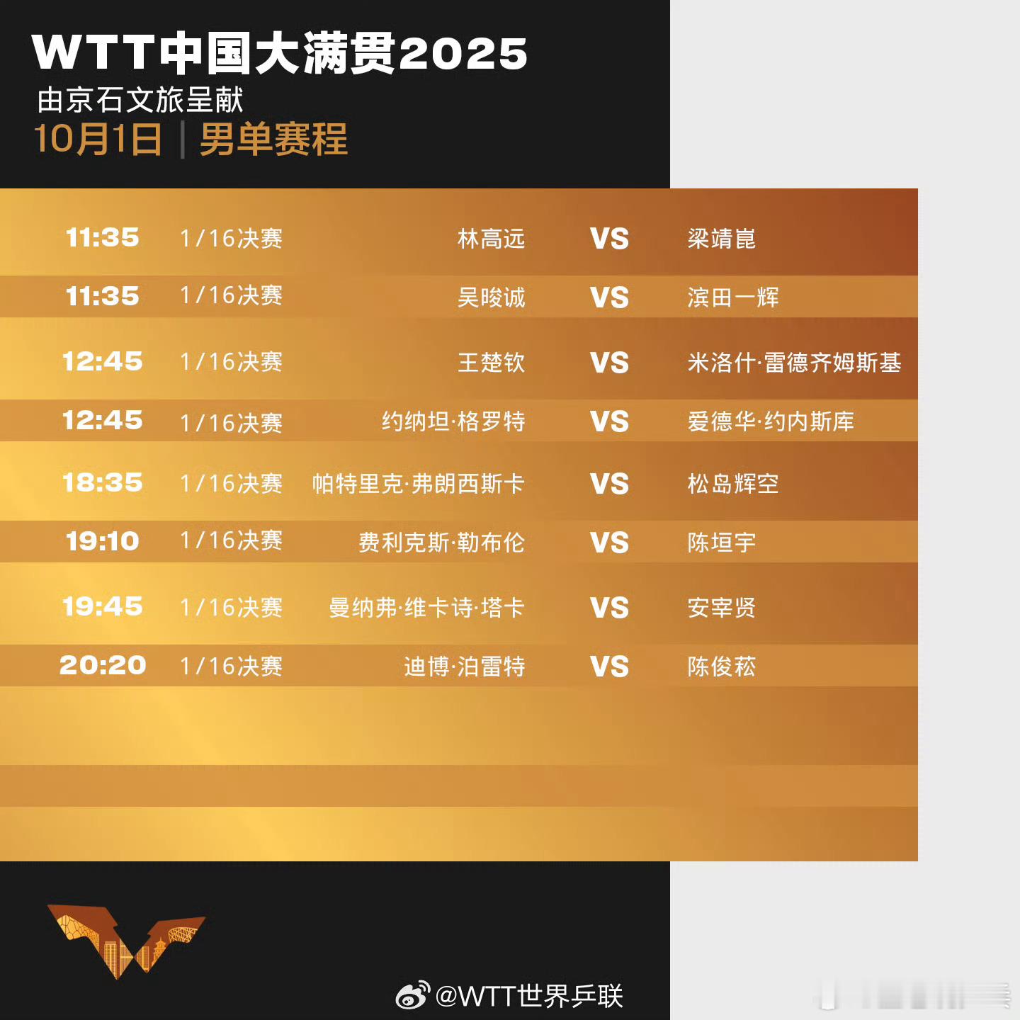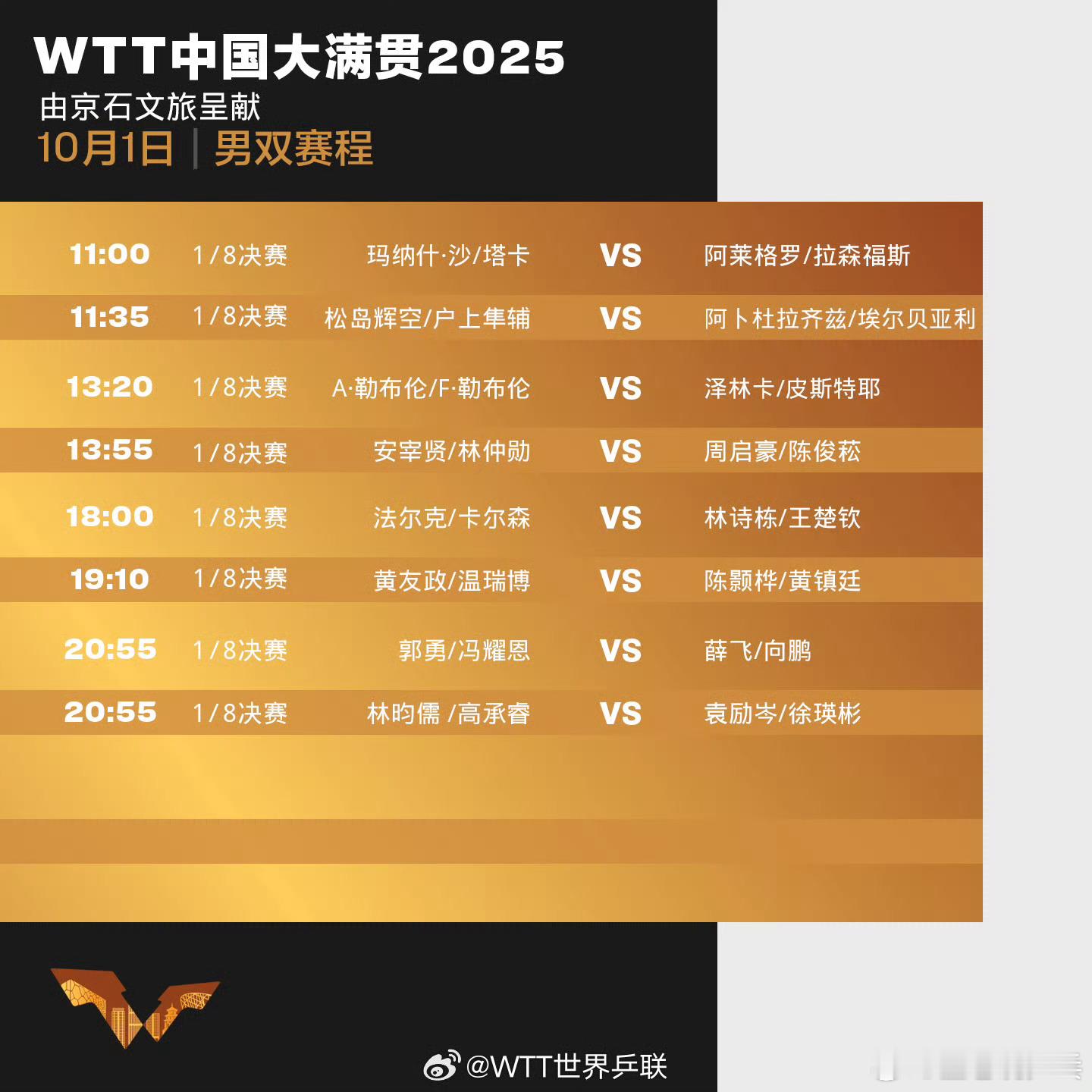 18:00 T1 王楚钦/林诗栋🇨🇳VS卡尔森/法尔克🇸🇪