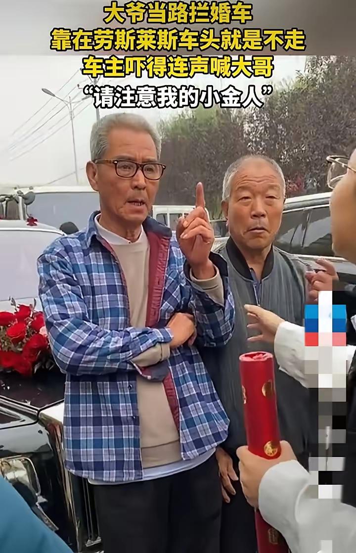 河北,一对新人结婚,劳斯莱斯婚车刚启动,突然一个大爷直接拦在车头前不让走,要想走
