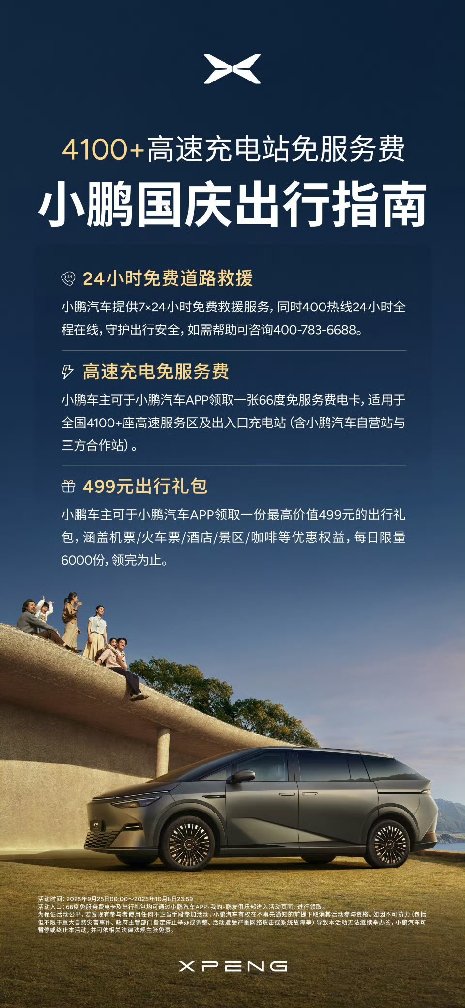 国庆小长假小鹏汽车还给车主准备了高速充电站服务费减免的政策,同时提供全天候救援服务,我鹏在细节处理上一直很到位。阿远说车