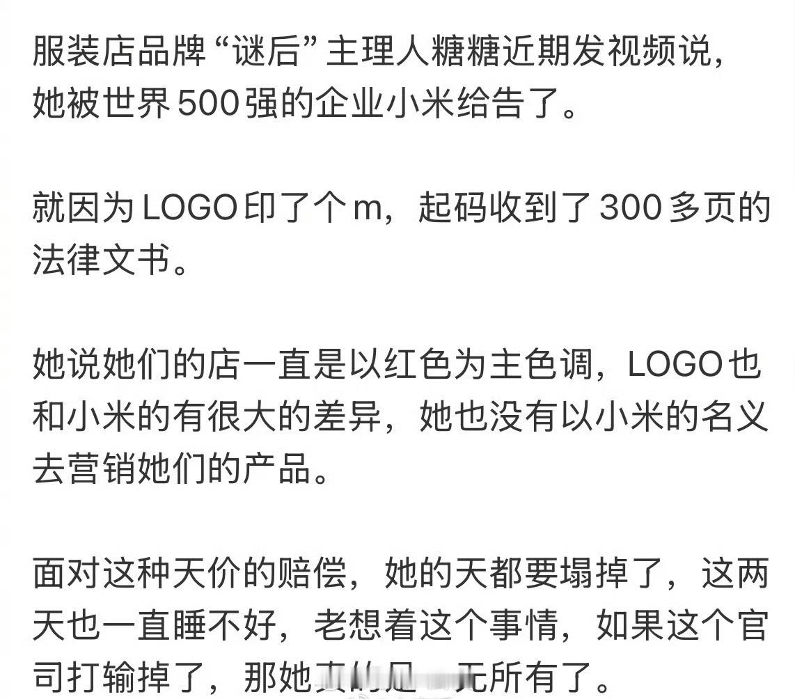 服装店称因logo相似被小米起诉服装品牌主理人哭诉:如果输就一无所有了,认为品牌LOGO和小米有很大差异[doge] ​​​