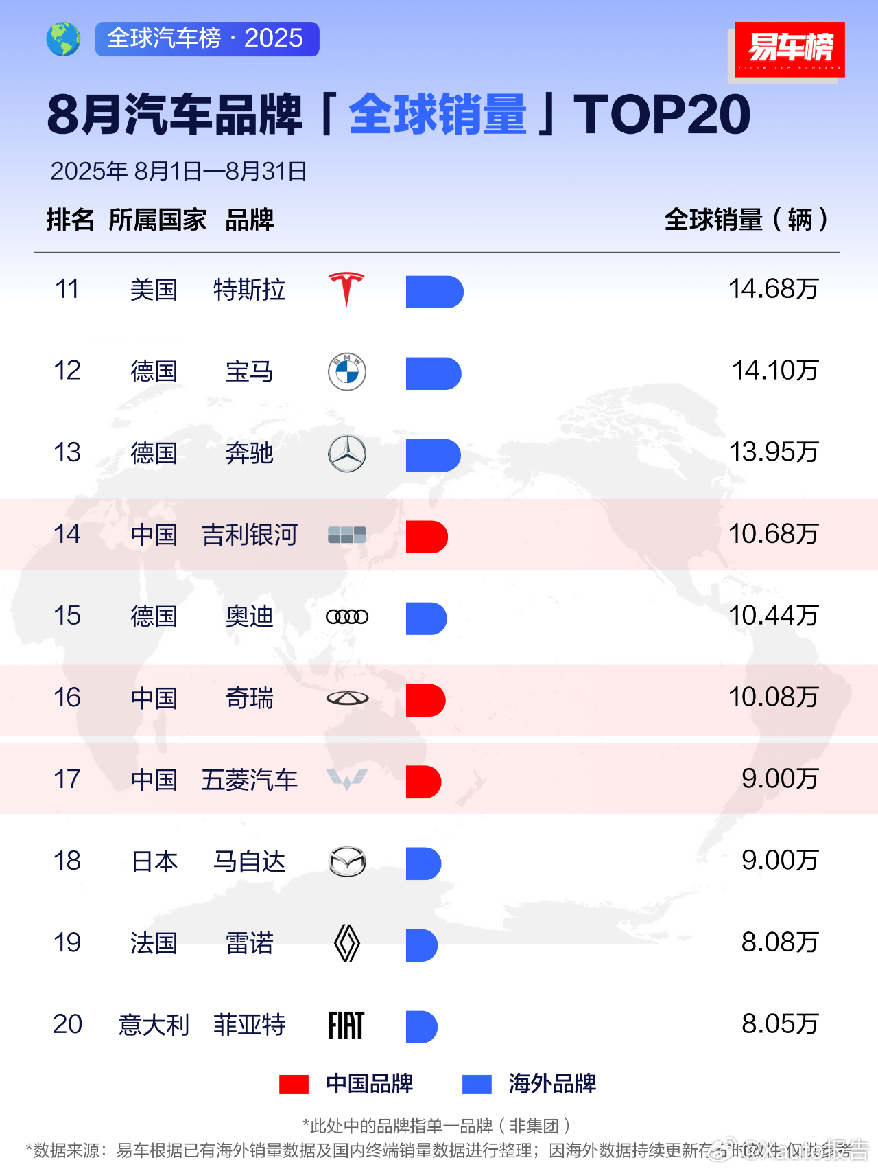 2025年8月汽车品牌全球销量TOP20根据易车整理的国内终端数据及海外销量数据