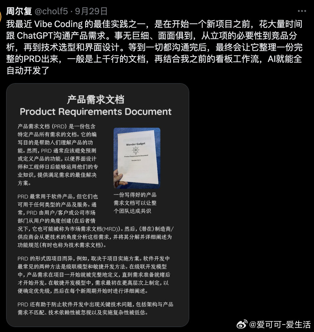 周尔复分享了一个高效的Vibe Coding实践:在启动新项目之前,花大量时间与ChatGPT深入沟通产品需求。从项目立项必要性、竞品分析,到技术选型和界面设计,事无巨细全覆盖。沟通完成后,让AI整理出一份上千行的完整PRD,配合看板工作流,基本实现全自动开发。