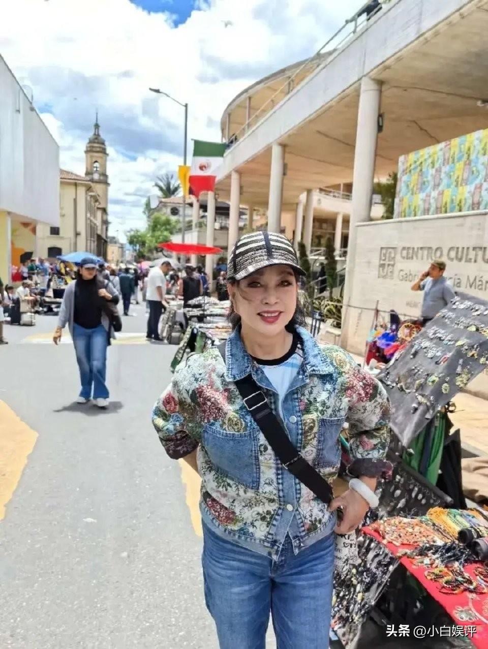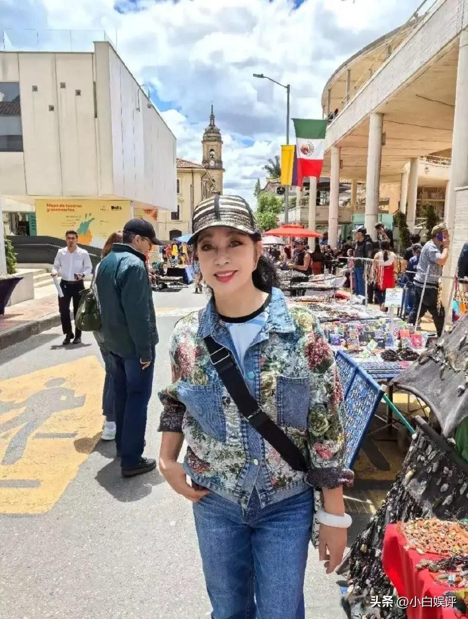 74岁的刘晓庆近照,她身穿一身花牛仔装扮,显得格外洋气有活力。照片中她戴着潮流鸭