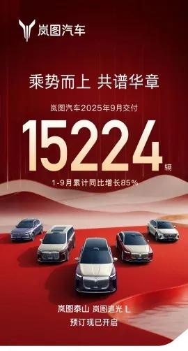 十一国庆,岚图第一时间报告了9月份交付量,突破15223辆,1-9月累计同比增长