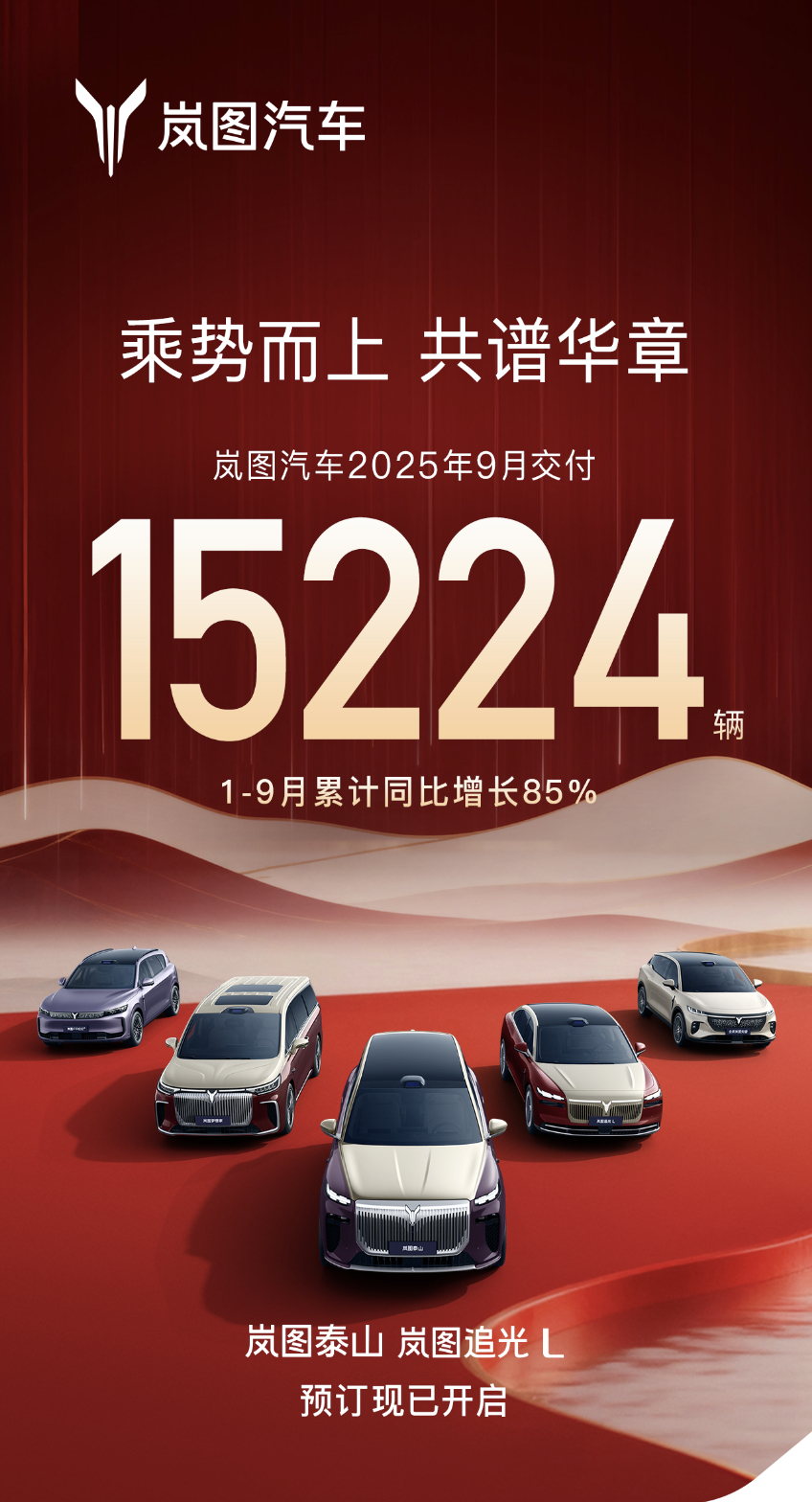9月,岚图加速布局明星产品矩阵。2026款岚图梦想家上市18小时订单破万,岚图泰山和岚图追光L 26日开启预订。三车均搭载800V、5C超充、华为乾崑ADS 4和鸿蒙座舱5等领先一代技术。依托“三旗舰”与“SUV双子星”协同发力,预计10月岚图汽车将迎来更强的增长势能。