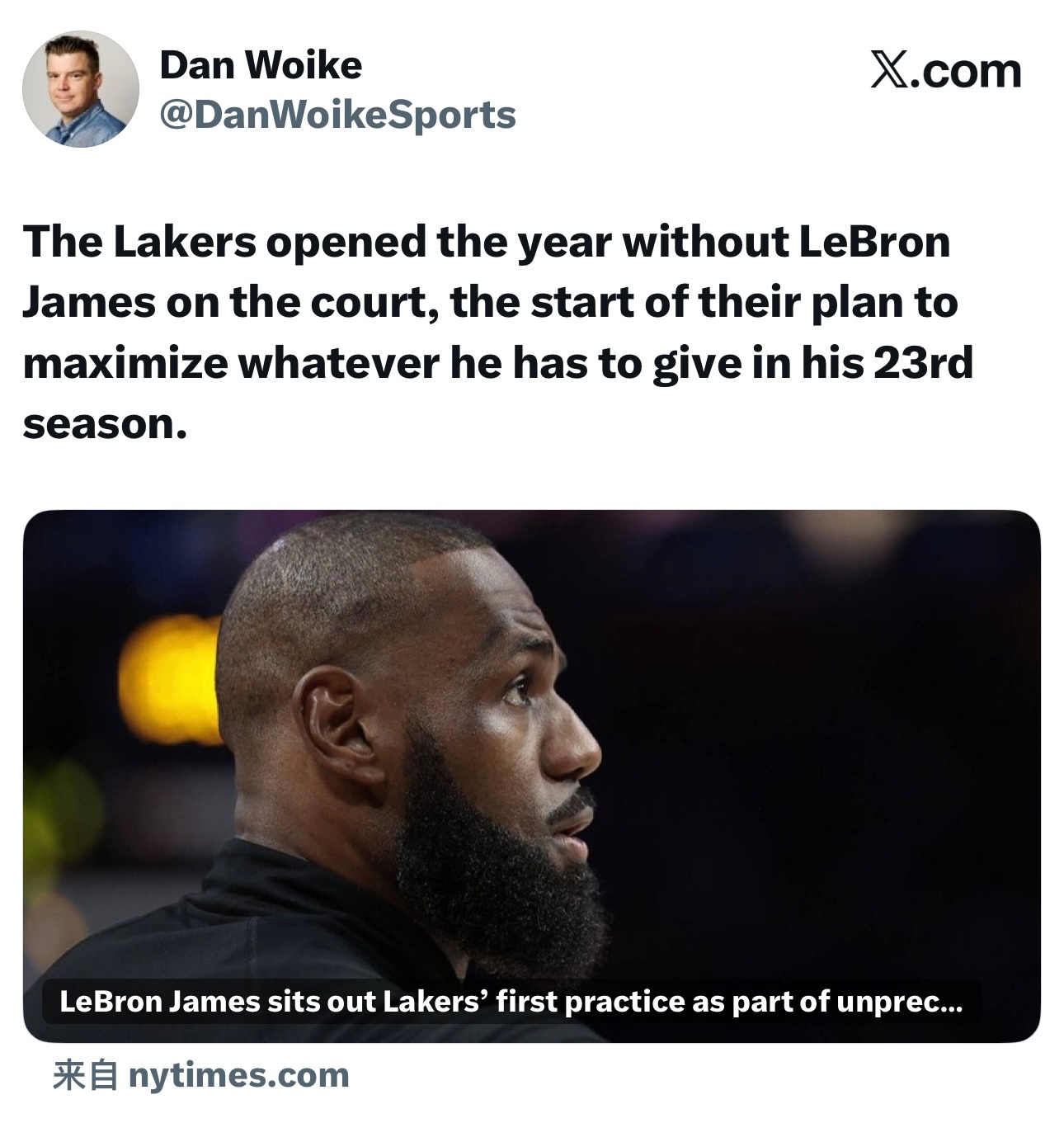 • 赛季目标优先级:湖人将詹姆斯是否能在揭幕战(10月21日)上场置于首位。虽然希望他能在季前赛亮相,但球队明确表示将根据恢复进展灵活调整计划。这种“长远视角”体现了对詹姆斯职业生涯的尊重,也反映了管理层对他身体状况的谨慎态度。