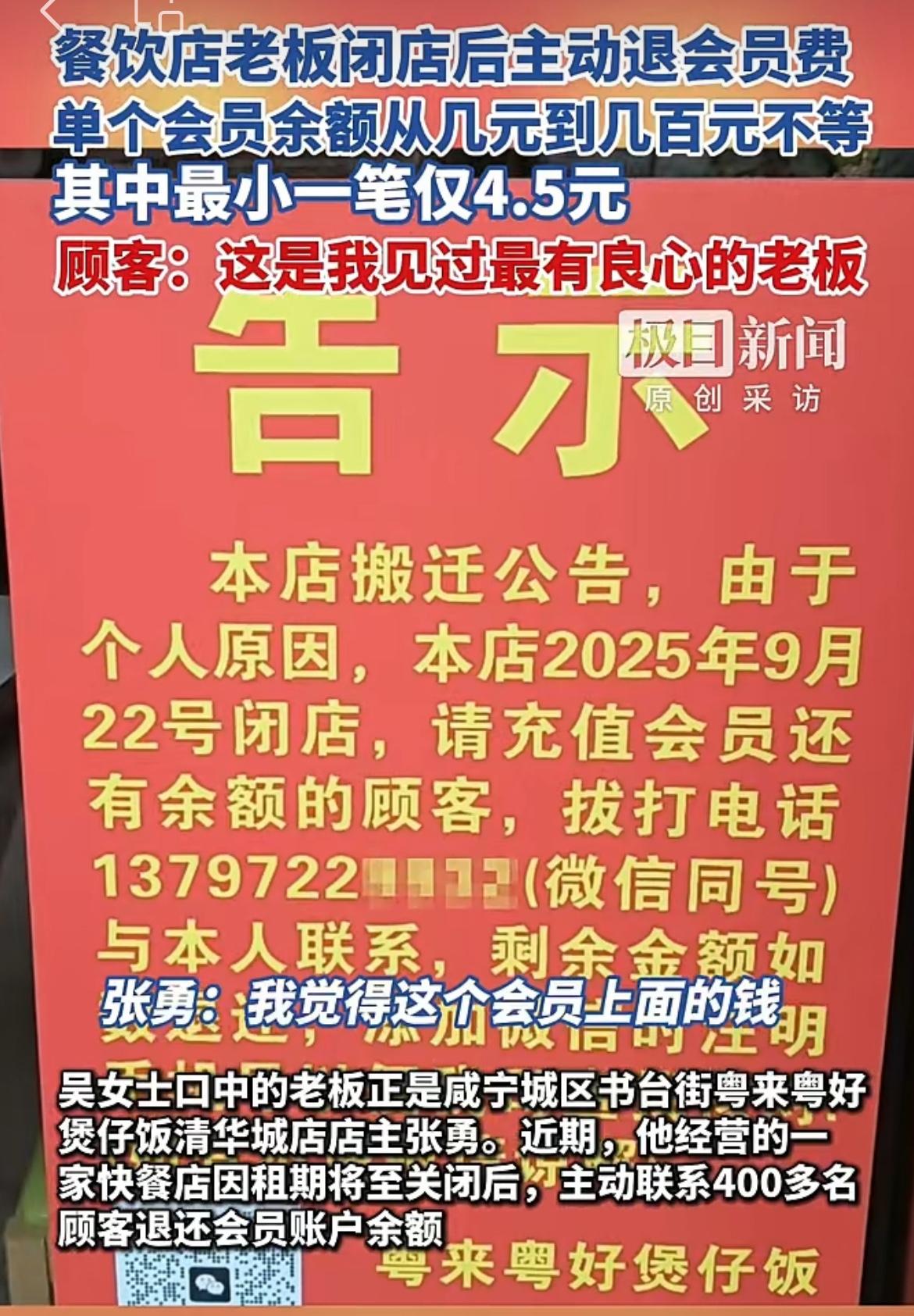湖北咸宁一餐馆闭店,老板挨个打电话退还顾客10901.31元会员费,众顾客纷纷点