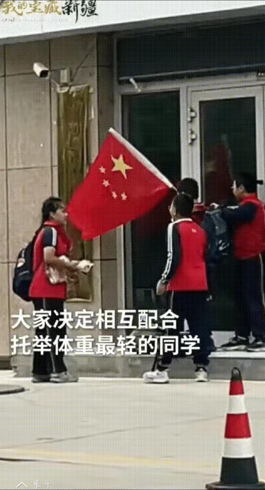 被新华社点名了!! 新疆库尔勒,一店铺门外悬挂的国旗掉在了地上,四名放学正好路过