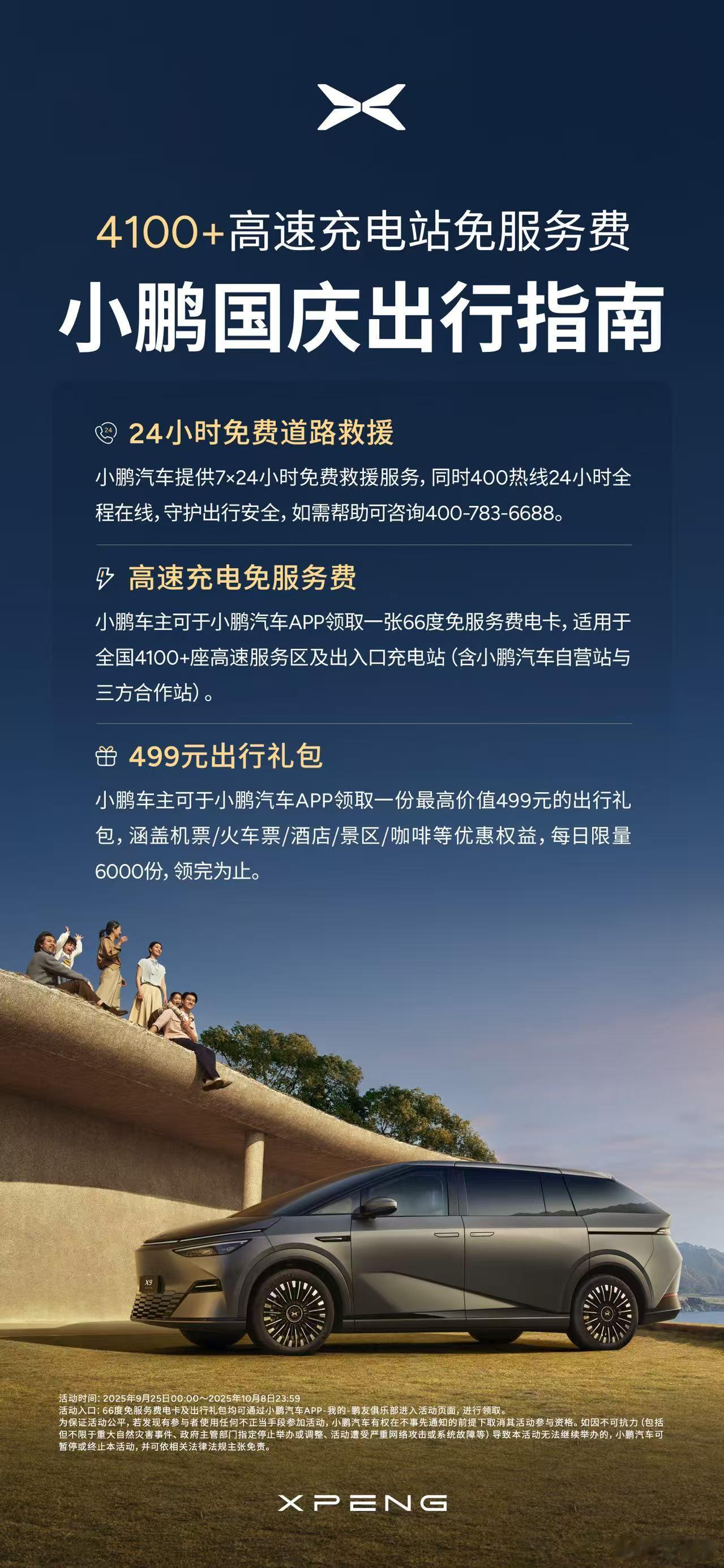 国庆暖心行动:免收4100+高速充电站服务费,24小时救援守护每一程。从技术厚度到用户温度,小鹏正以硬核交付力,驱动中国智造全球领跑!小鹏为车主免4100座高速充电站服务费