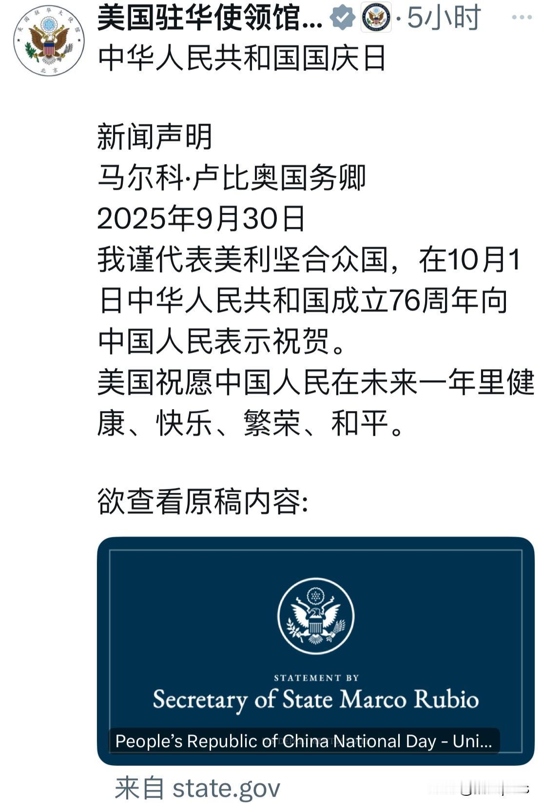美国驻华使领馆的社交媒体账号转发了美国国务卿祝贺中国国庆76周年的声明。在声明里