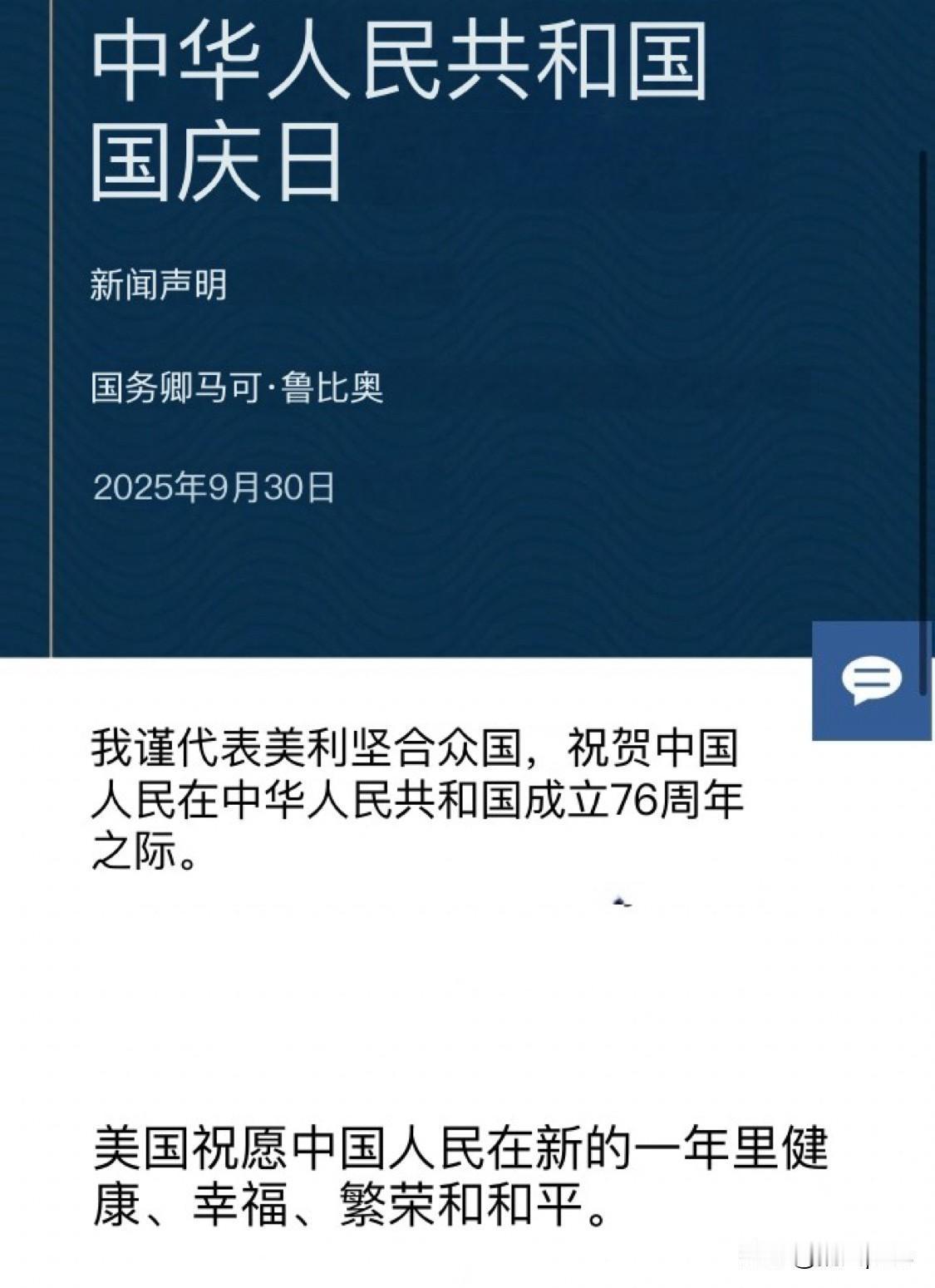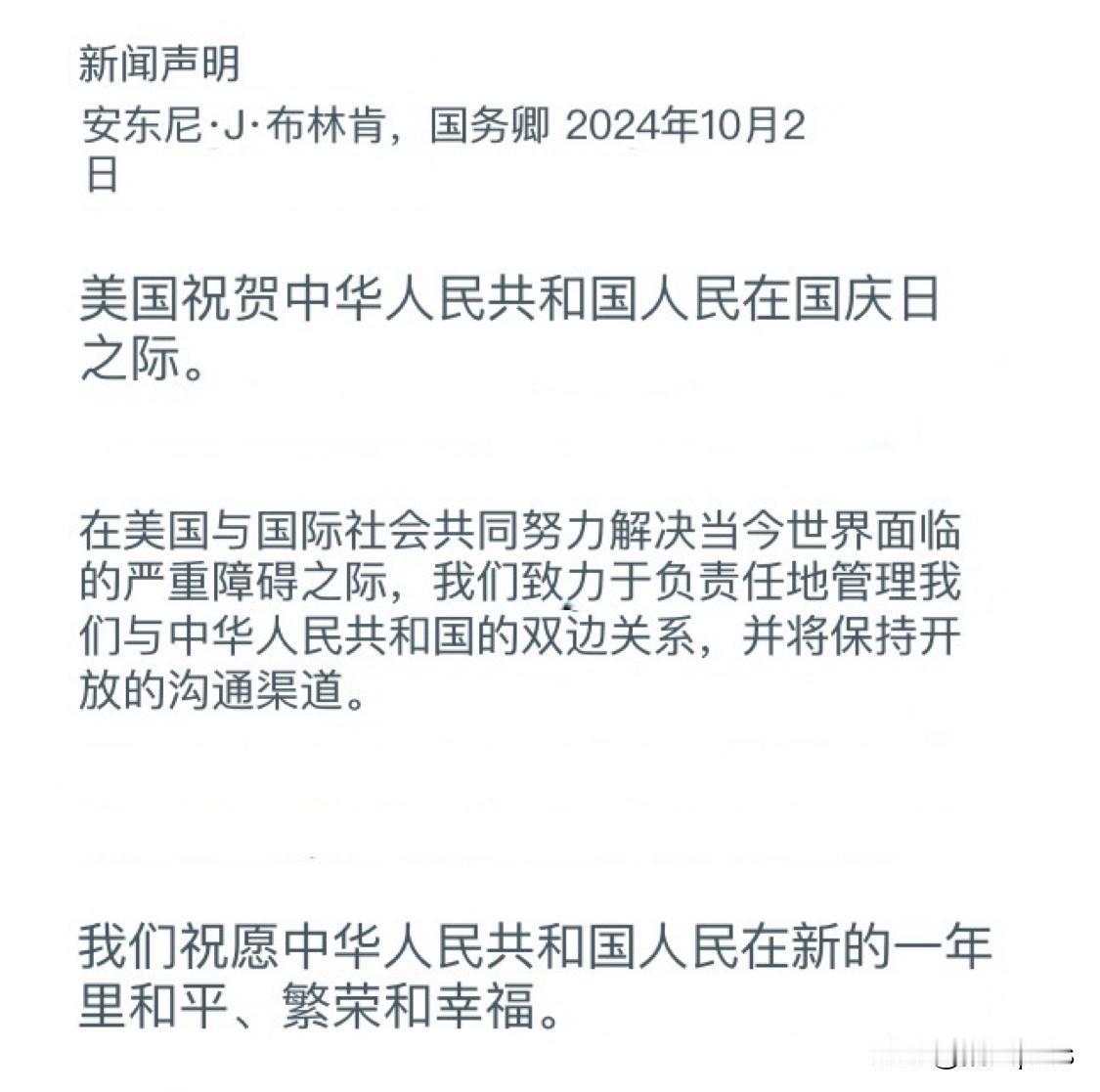 可以对比一下鲁比奥与布林肯在祝贺中国国庆时候的措辞。鲁比奥的祝贺里面多了“健康”一词,从这一点来看,鲁比奥今年的表态是胜过去年布林肯的表态的。 鲁比奥说的是“美国祝愿中国人民健康、幸福、繁荣、和平”。而布林肯说的是“我们祝愿中华人民共和国人民和平、繁荣、幸福”。 鲁比奥祝贺比较全面,而且看起来更舒服一些。把“健康、幸福”放在了前面。而布林肯把“幸福”放在了最后面,而且也没说“健康”一词。 鲁比奥用的是“美国”祝贺“中国人民”,而布林肯说的是“我们”祝贺“中华人民共和国人民”。布林肯显然是在这里玩弄文字游戏,只说“我们”,可以是代表他的团队而已,而没有明确的说是“美国”祝贺。 布林肯的祝贺虽然有三段,但是完全没有什么情感,还特意强调什么“在美国与国际社会共同努力解决当今世界面临严重障碍之际”。整段话就是布林肯在阴阳怪气地说话。 而且去年布林肯还拖了两天再发声明。这也打破了惯例,显然是故意而为之。反观鲁比奥恢复了惯例,而且整个声明尽管简短,但是面面俱到,至少没有掺杂什么个人情感在里面。