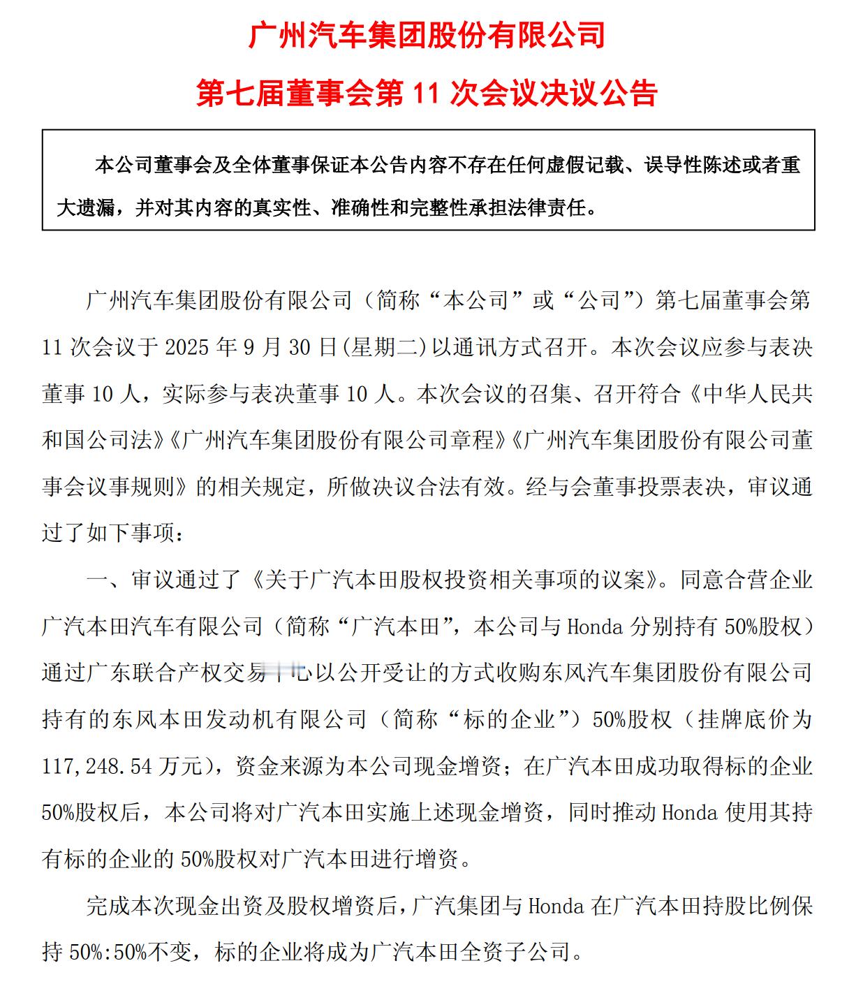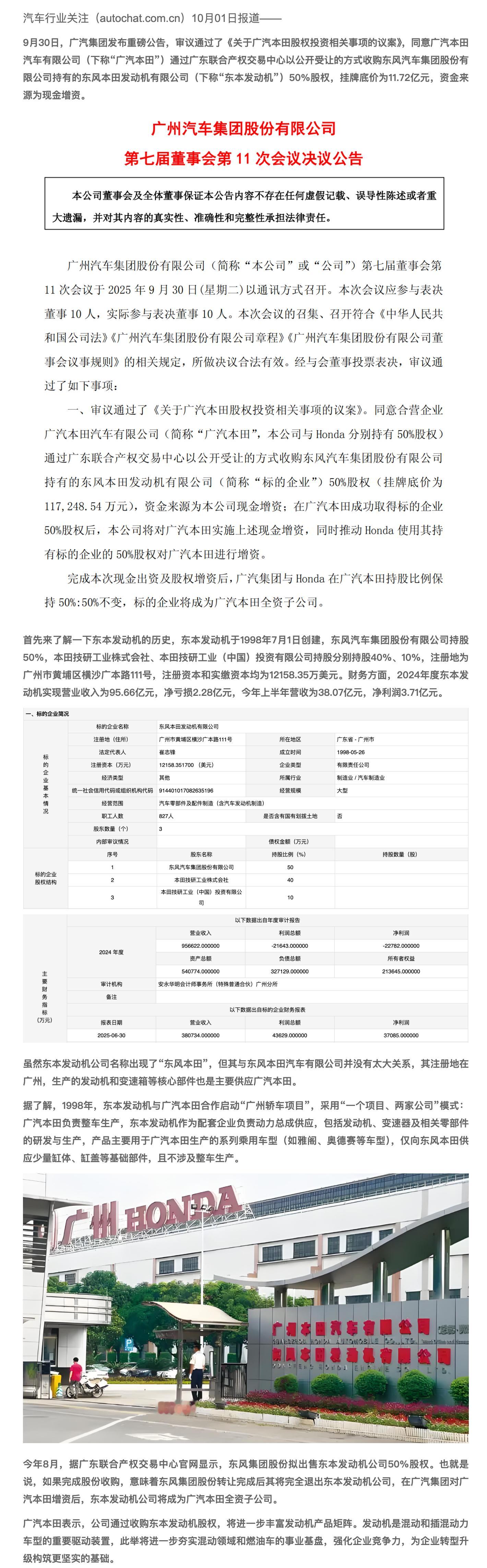 广汽集团公告,广汽本田将以11.72亿元收购东风汽车集团持有的东风本田发动机50%股权。
