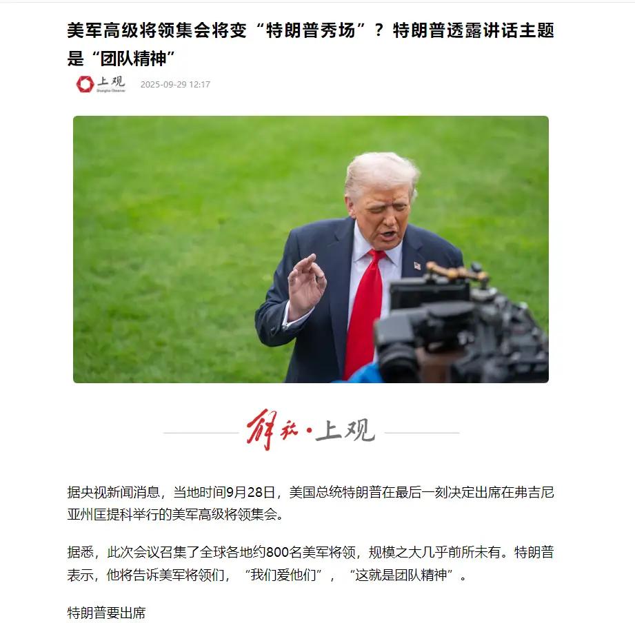 美军闹了个大笑话,800多将领紧急赶回美国,本以为要发动战争,谁想到是特朗普政府对美军的“服从性测试”,高级指挥官们,被一个退役少校训的抬不起头。 一开始,紧急召集800多名高级将领集合秘密受训,大家还以为有什么不得了的大动作,一个个都不敢耽搁,最快时间到达训练场地。 结果到了才知道,不是什么秘密行动,更不是什么保密计划,而是要给他们上课,教会他们明白“武士精神”,一句话概括就是必要时做好为国牺牲的准备! 刚听到消息时,驻守在全球关键战区的美军将领们,想到的可能是中东突如其来的危机,或是太平洋方向的紧急态势。 他们连夜跨洋赶回美国,降落在弗吉尼亚州的匡蒂科海军陆战队基地。可等待他们的并非绝密作战指令,而是一场被媒体称为“服从性测试”的特殊集会。 让这么多高级指挥官放下手头的防务工作,长途跋涉就为了参加一场形式大于内容的集会,不仅耗费了数百万美元的公共资金,更在短期内造成了前线指挥链的真空! 换句话说,这相当于把美军全球部署的神经中枢暂时集中到了一个地方,无论从安全还是效率角度来看都存在不小的隐患,难保不会有人趁机做点什么。 美军一直引以为傲的专业性在这出“政治秀”面前打了不小的折扣。军队的核心使命是保家卫国,而现在忠诚已经成了一场表演和作秀,当这个根本被动摇时,最终受损的是整个国家的安全基础! (每天更新您关心的事,欢迎点赞关注,转发给朋友一起探讨!) 只看表象的话,这步棋确实下的很失败。对此大家有什么看法?