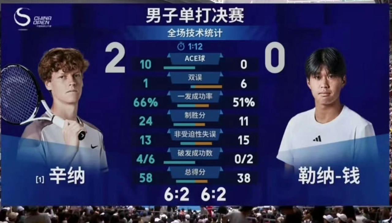 一场最没悬念的决赛!仅耗时1小时12分钟,辛纳6-2/6-2轻取勒纳钱夺冠。 勒纳·钱可以一路打败塞伦多罗、科博利、把穆塞蒂打到决胜盘退赛、把梅总磨到抽筋伤退,但面对辛纳,他所能做的事情确实不多——他的攻击力不足以威胁到辛纳,而自己的防御系统又无法阻挡辛纳犀利的攻击。 19岁的美国亚裔新星勒纳钱,世界排名已升至第33位)。母亲为华裔,祖父母是越南华裔,家族早年移民美国加州尔。教练为华裔网坛名宿张德培(2025年8月加入团队)。 他从资格赛一路晋级正赛,成为本届赛事最大黑马。