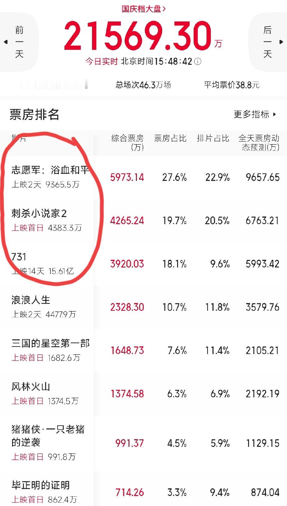 今年国庆档太有意思了,10月1日第一天,5部新片单日票房不如已经上映14天的老片,最大赢家让人没想到。 国庆档首张成绩单出炉!在2025年10月1日的国庆档票房榜单上,《731》以上映14天的“老片”身份,狂揽3920.03万票房,票房占比18.1%,力压多部首日上映的新片,堪称当日最大赢家。 反观一众新片,《志愿军:浴血和平》《刺杀小说家2》作为备受期待的两部续作,位列前2;《三国的星空第一部》《风林火山》《猪猪侠·一只老猪的逆袭》《毕正明的证明》等新片,票房成绩均低于《731》。即便是上映2天的《浪浪人生》,在单日票房表现上,也没能将《731》甩在身后。 让人十分意外,《731》抢走了国庆档第3名的位置。 《731》能在强手如林的国庆档中持续发力,一方面源于其题材的独特性与深刻性,引发了观众对历史的关注与思考;另一方面,也说明优质影片的票房生命力可以突破上映时间的限制,凭借口碑和题材优势在竞争激烈的档期里脱颖而出。这一现象也为电影市场提供了新的思考:影片的品质和题材共鸣,或许比上映时机更能决定其票房走势,国庆档不再是新片的独角戏,口碑佳作的长尾效应同样值得关注。