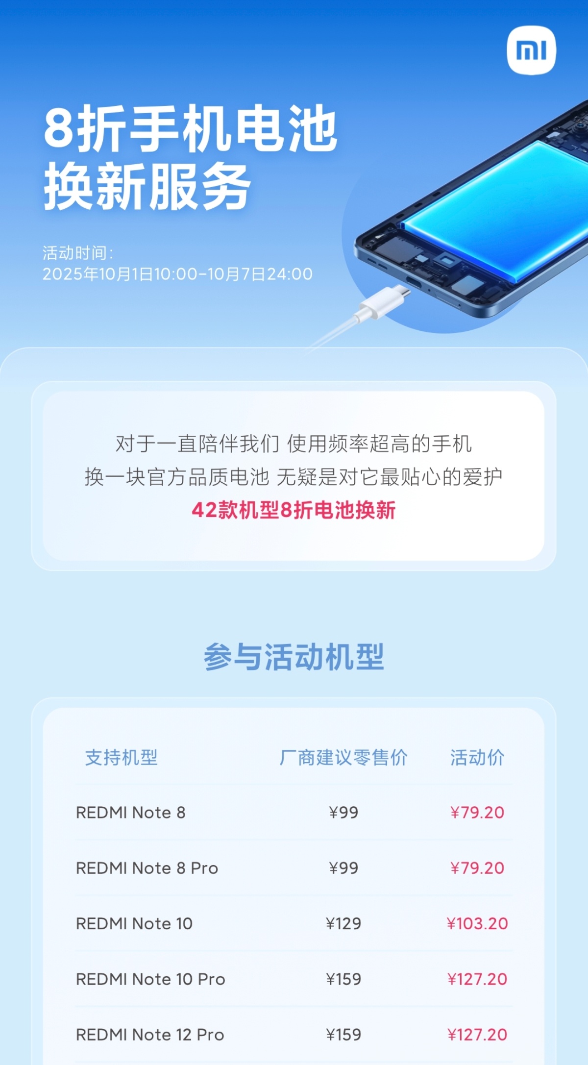 小米服务真诚奔赴 十月服务周丨手机电池换新79.2元起。