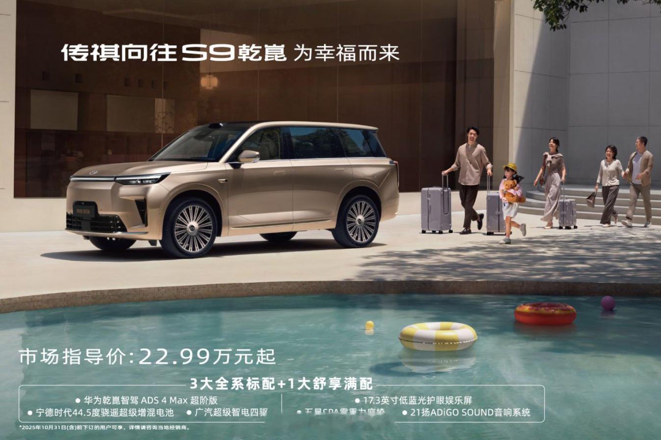 22万级华系插混王,传祺向往S9乾崑版,把华为乾崑智驾ADS 4、宁德时代44.5°骁遥电池、广汽超级智电四驱一次给齐,安全、续航、驾控全拉满,入门即高配。