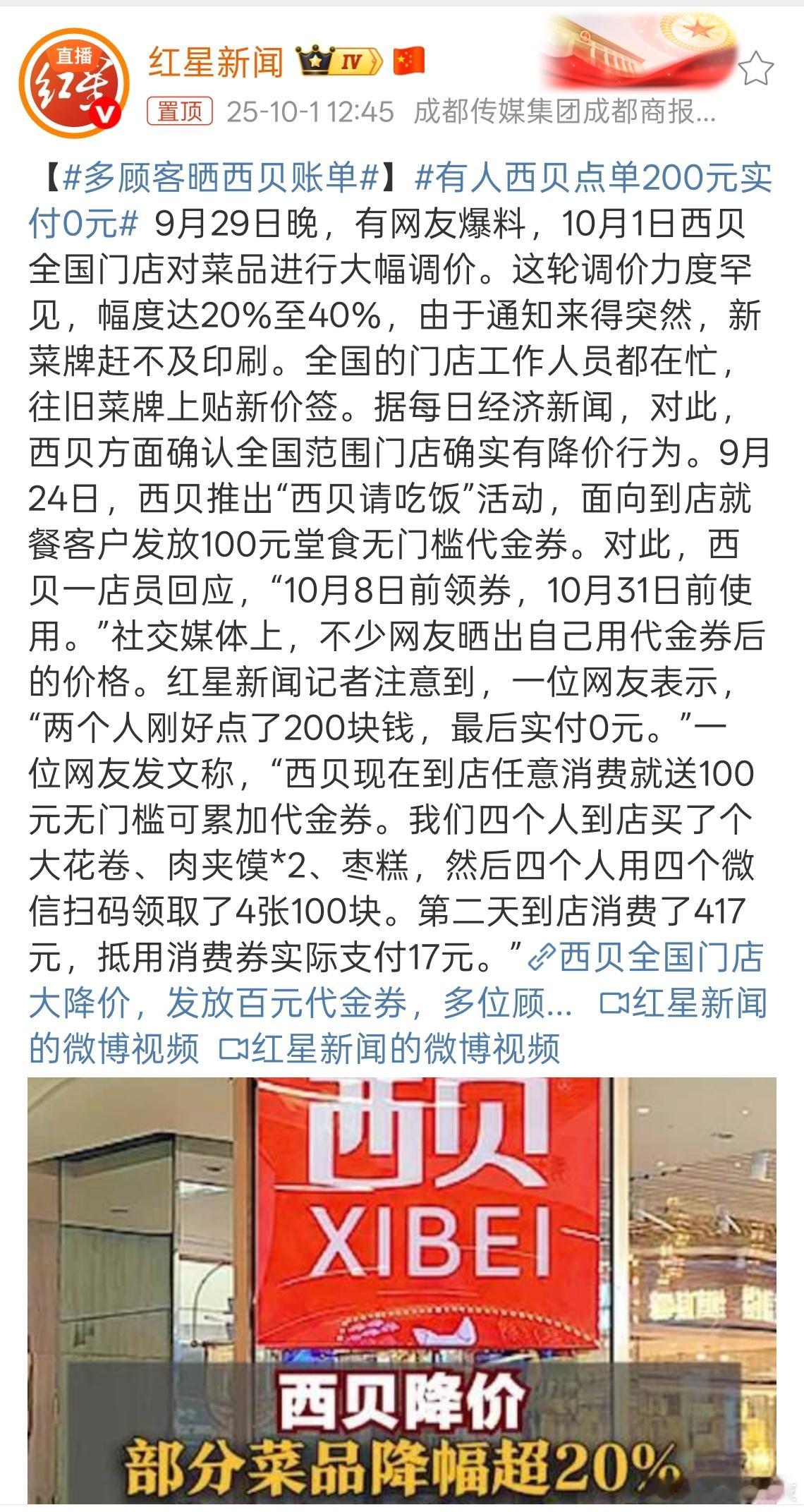 有人西贝点单200元实付0元大幅度降价20%至40%,最近去西贝吃过饭吗?