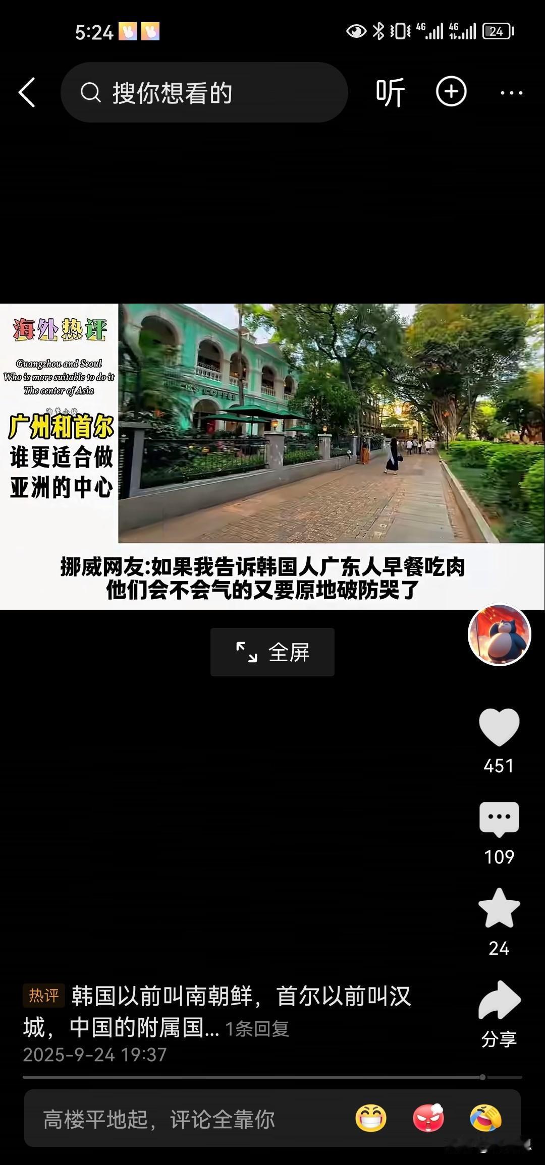 韩国人说广州比不上他们的首都首尔。他们不知道,他们之前首都叫汉城,是由中国命名的城市,广州有2000多年的建城史,他们有吗?更搞笑的,一个韩国人“无知无畏”地说:衡量城市是否发达,要看人们是否吃得起泡菜,听说广东人很少吃得起泡菜,他们很可怜。”太搞笑了,广东的早茶比韩国的国宴还丰富[呲牙][呲牙][呲牙]