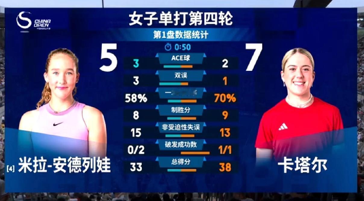 今天的中网1/8决赛,英国女子网球选手卡塔尔这体格和奔跑能力也真够米拉.安德列娃喝一壶的,尽管安德列娃排名远高于卡塔尔,但在首盘,安德列娃并无优势可言,反而是卡塔尔打的更高效、更具威胁。卡塔尔在第十二局火力全开以lovegame完成首盘两人的唯一一次破发,以7-5拿下首盘。 首盘技术数据显示,安德列娃获得2次破发机会,但全部浪费,而卡塔尔仅获得一次破发机会,但却100%兑现,在其它数据方面,双方相差无几。看来,今天这场比赛的结果这不好说,如果安德列娃不寻求改变的话,很可能被爆冷出局。