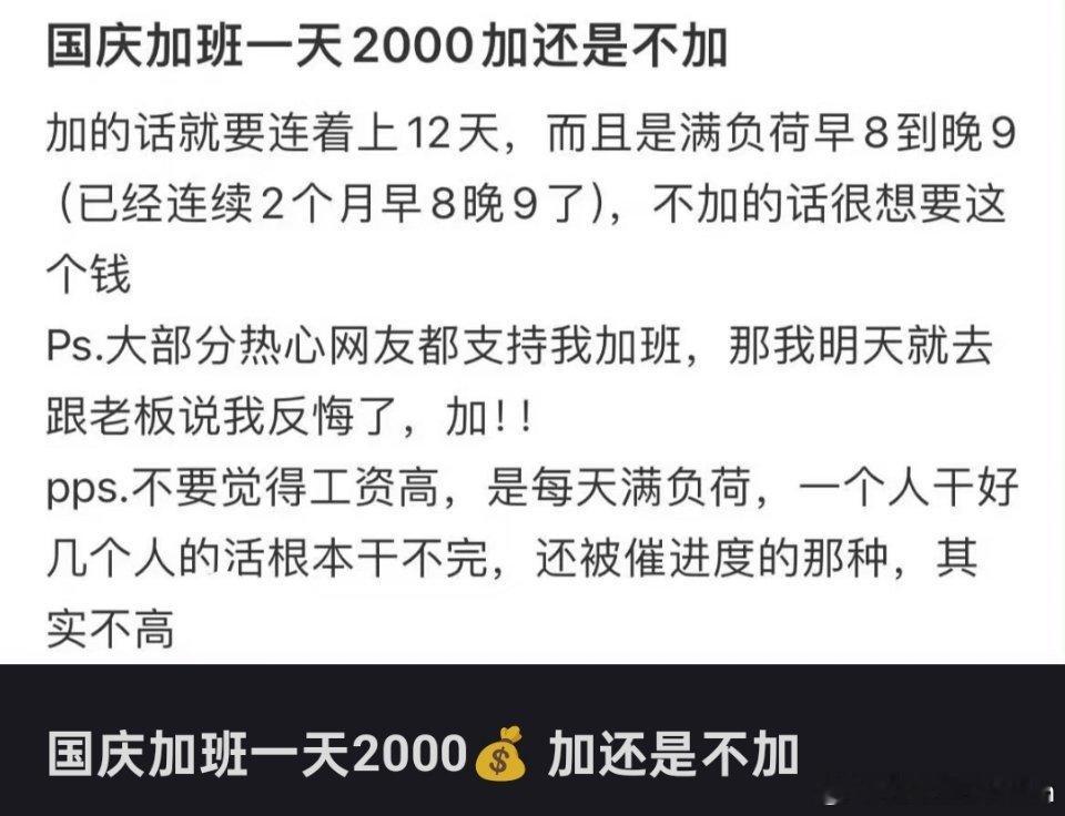 赚三薪国庆加班,有网友开始赚三薪了,都在纠结要不要加班,加班一天2000呢。[哆啦A梦吃惊][哆啦A梦吃惊]