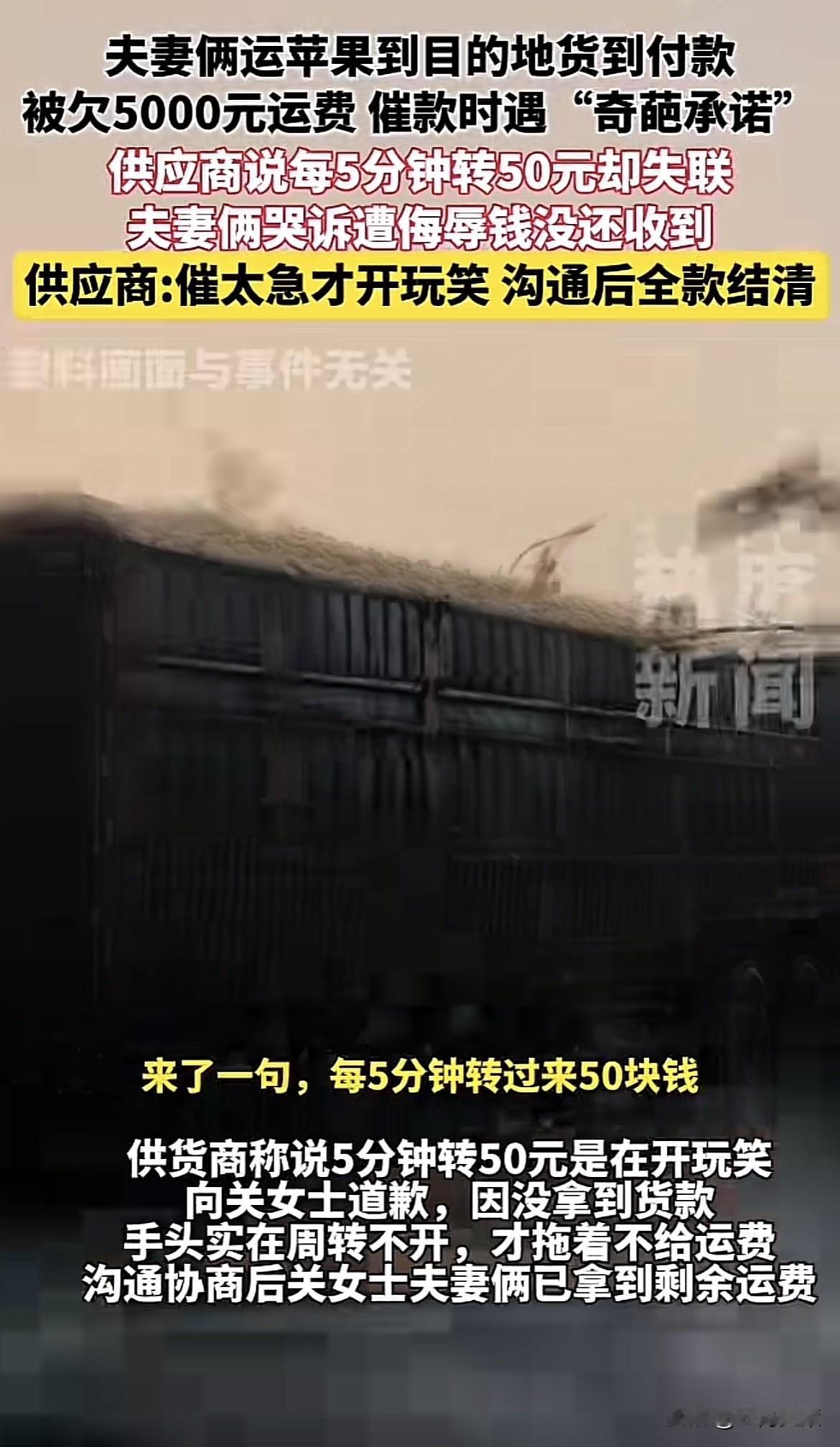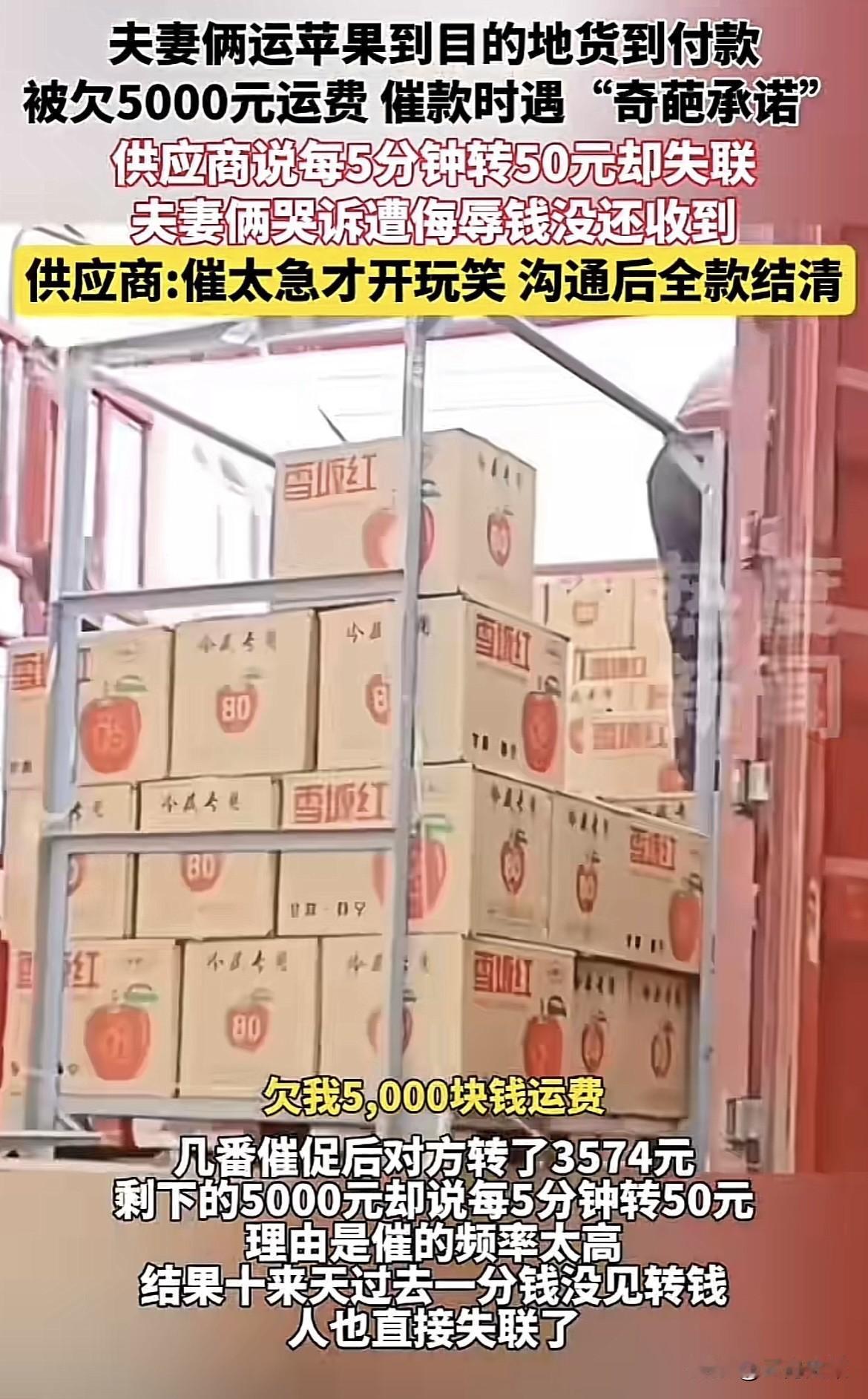 坏了良心了!河南一夫妻给饮料厂拉苹果,说好是货到付款,可将苹果送到目的地后,供应厂商却不肯结运费,后面又改口说,要每5分钟转50元,结果人又失联了,夫妻俩觉得对方实在侮辱他们,无奈选择求助媒体,结局让人意外! 据热度新闻,9月29日报道,一对夫妻将货物拉到送货地的时候,供应商迟迟不肯结运费,经夫妻俩的多次催促之后,供应商竟做出了令人“恶心”的行为。 事情的起因是老王(化名)是一名运货司机,每次出车的时候妻子也经常在车上帮忙。然而那天他看到了一个订单,需要将一车的苹果运送到凉山,刚开始的时候老王还觉得距离有些远,就不想接这个活了。但等他看到能赚到不少的时候,毫不犹豫的就接了。 紧接着他和妻子马不停蹄的赶紧将苹果搬运到了自己的车上,随后便开启了运货之路。夫妻二人整整忙活两天之后,终于将这批货运送到了供应商所提供的地址,到那儿卸完货之后,老王便向供应商要了运费。 这时候供应商却说运费要第二天再给,这时老王想着也不差这一天了,不料过了好几天之后,供应商一直没有说付运费的事情了,老王就主动问了起来。经过多次的催促之后,供应商就先支付了三千元。 随后供应商还说剩下的5000元不会一下子全部给他转过去,故意分批次一点一点转,老王虽然觉得对方有点侮辱他,但是想着能把钱结算清楚也行,就没有搭理对方。 不料这时候供应商还是没有给他转钱,而且等老王再去联系他的时候就已经联系不上了,无奈之下老王就找到了记者,希望记者能够帮忙协商这件事情,能够快点拿到尾款。 随后等记者联系到供应商之后,供应商的态度发生了很大的转变,说之所以给老王说一会儿给他转一点是在和老王开玩笑。此外,供应商还表明态度说最近货物,因为没有倒腾出去,资金有些紧张,过一段时间之后一定会一分不差的给老王转过去的。 当网友看到了这件事情之后,在下面评论说供应商老板做的也太不合理了,竟然拿着别人的血汗钱来开玩笑。 每个人赚钱都不容易,而且背后都有一家子需要养活所以,双双方之间一定要相互体谅,这样才能够长久的合作下去。 那么对于这件事情,你还有什么想说的吗?