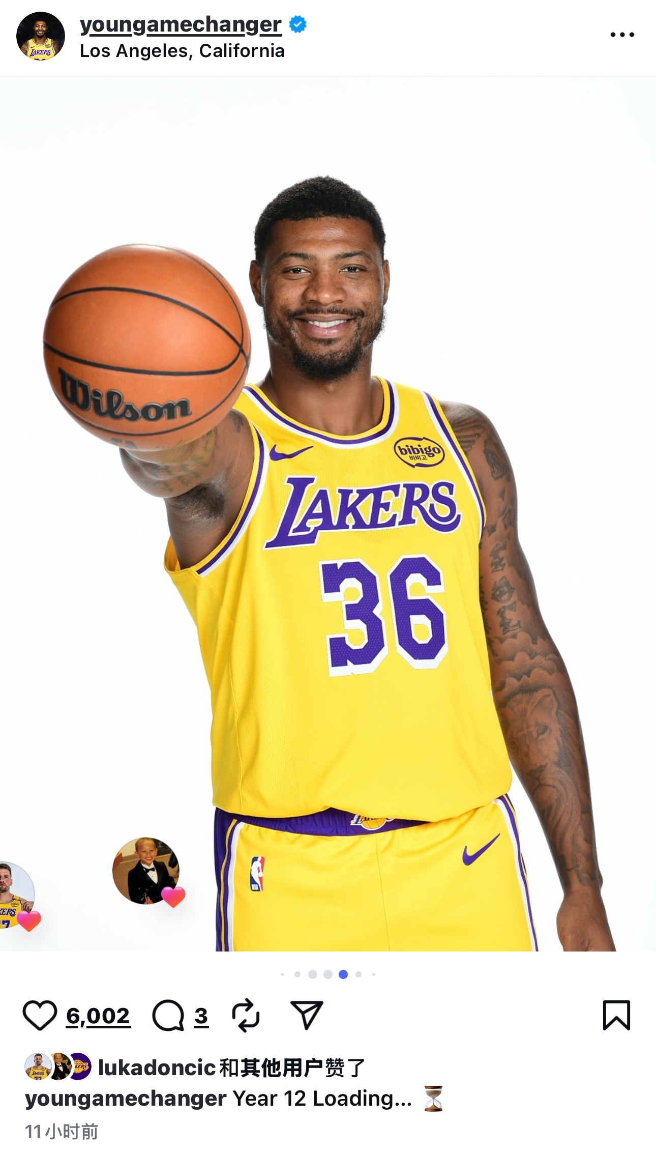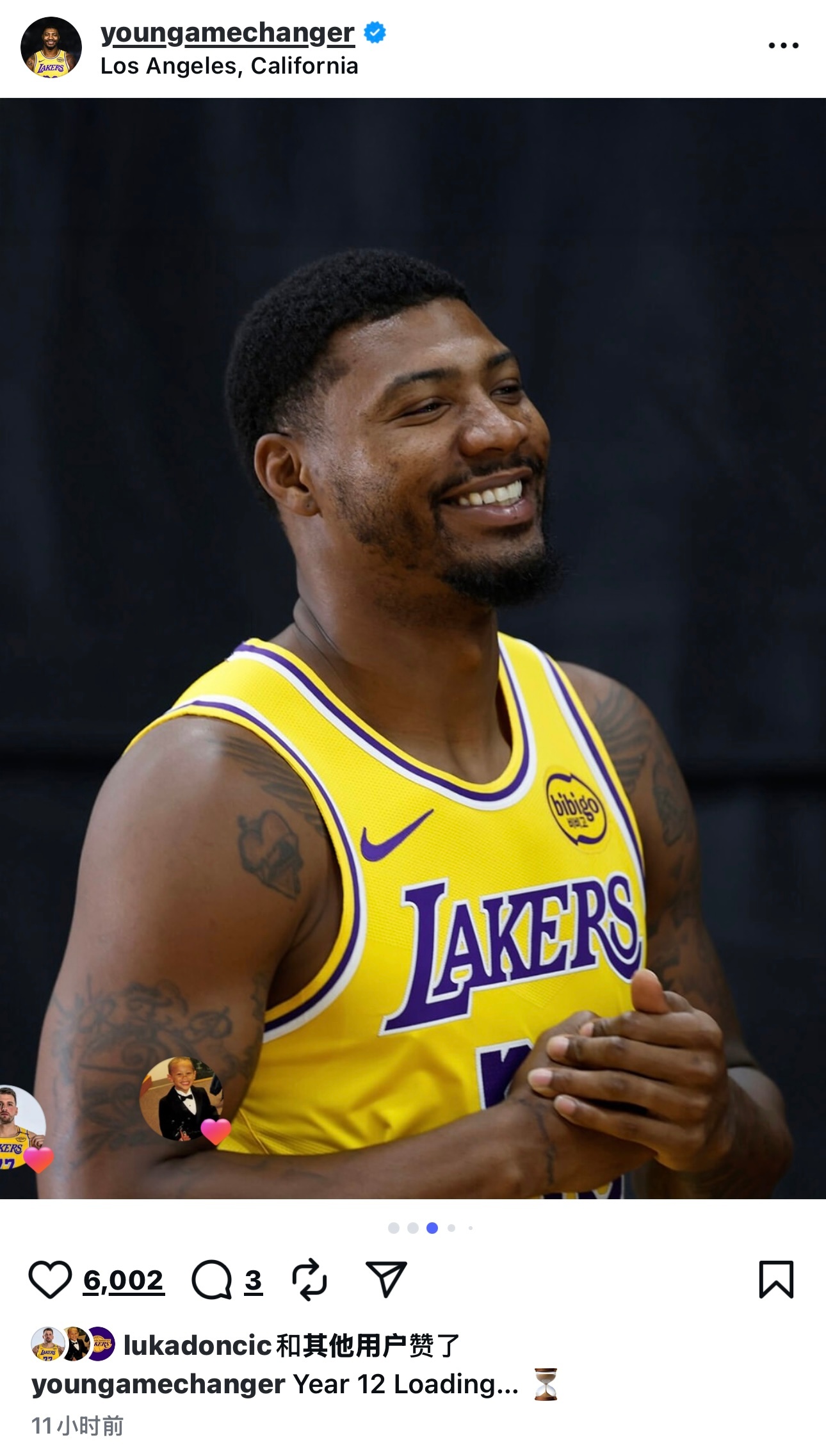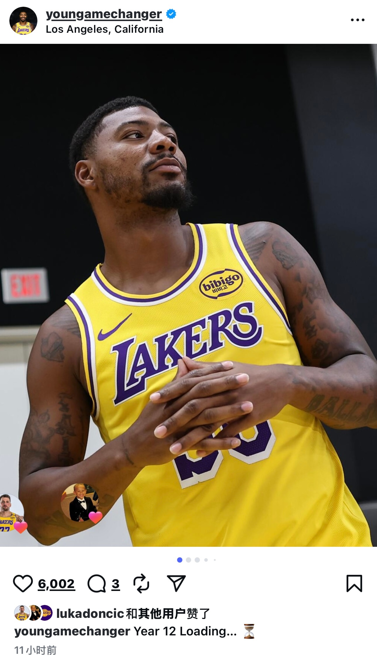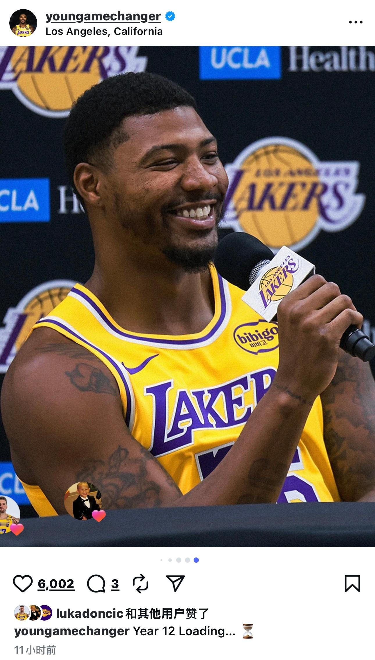 湖人后卫斯玛特更新社交媒体晒出媒体日和训练营照片,现队友东契奇、海斯、蒂耶罗,前队友杰伦布朗点赞👍