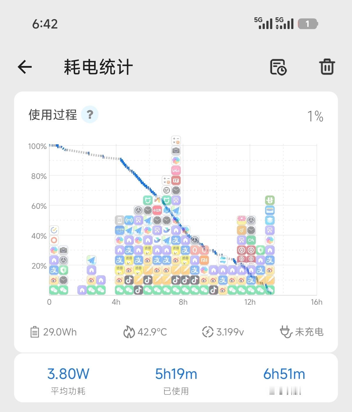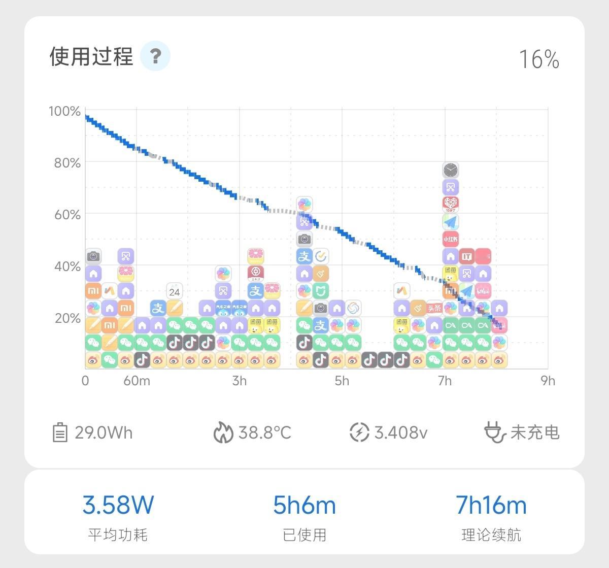 Day 1(图一图二图三),长时间在户外(数据+屏幕激发亮度),负载也也不算低了,平均功耗3.8瓦,理论续航6小时51分。
