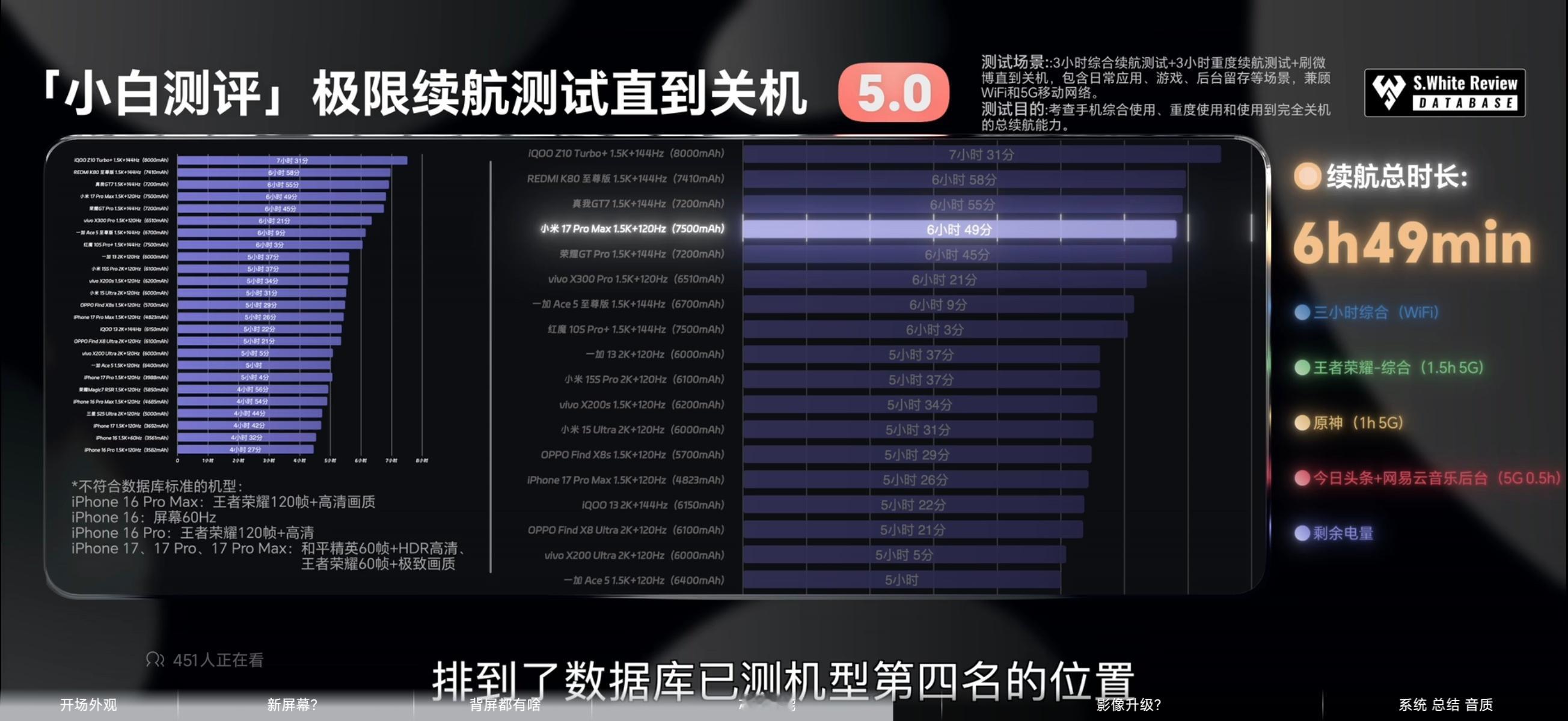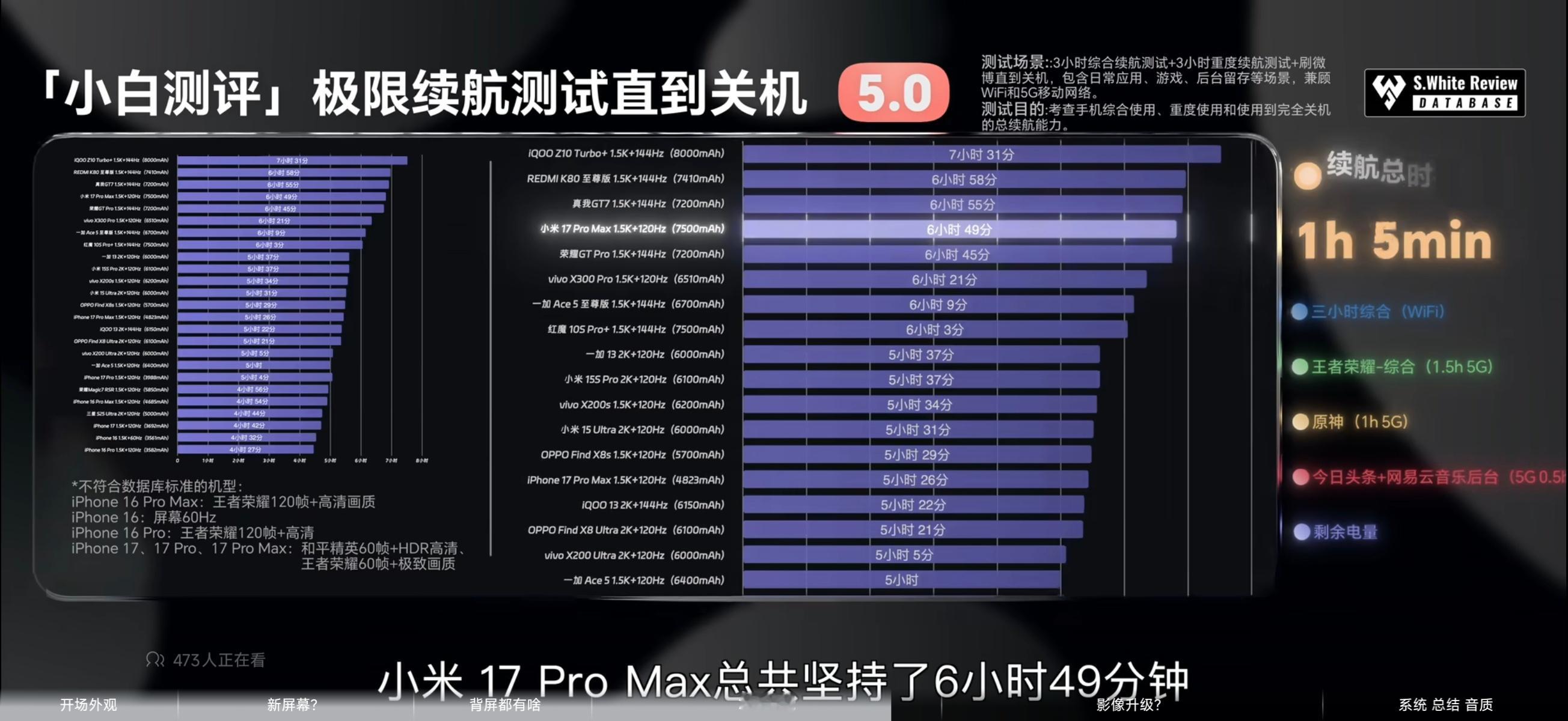 整体上符合“小白评测”的续航测试成绩(6小时49分),同时Xiaomi 17 Pro Max是小白评测数据库已测测试机型第四名位置。
