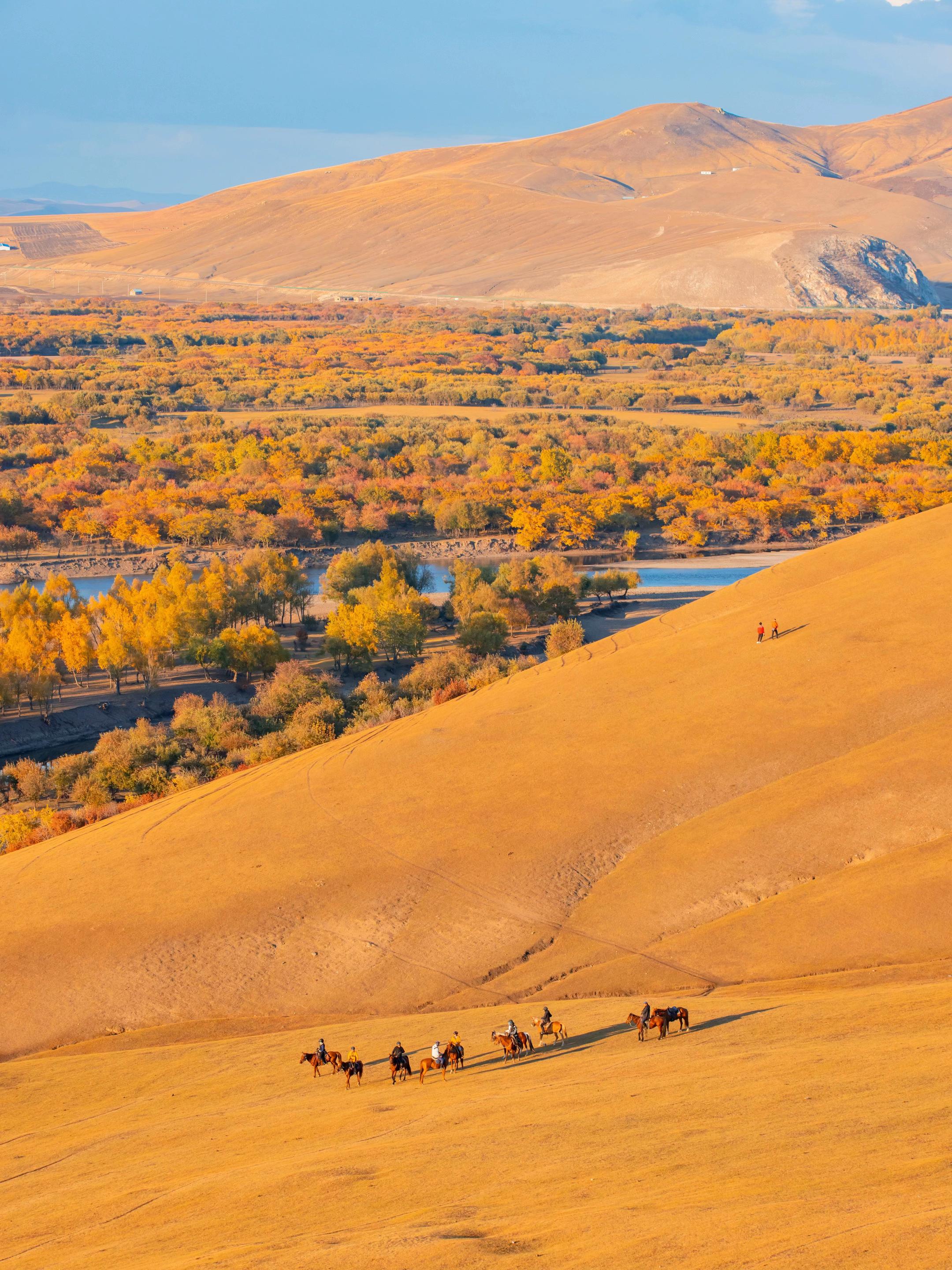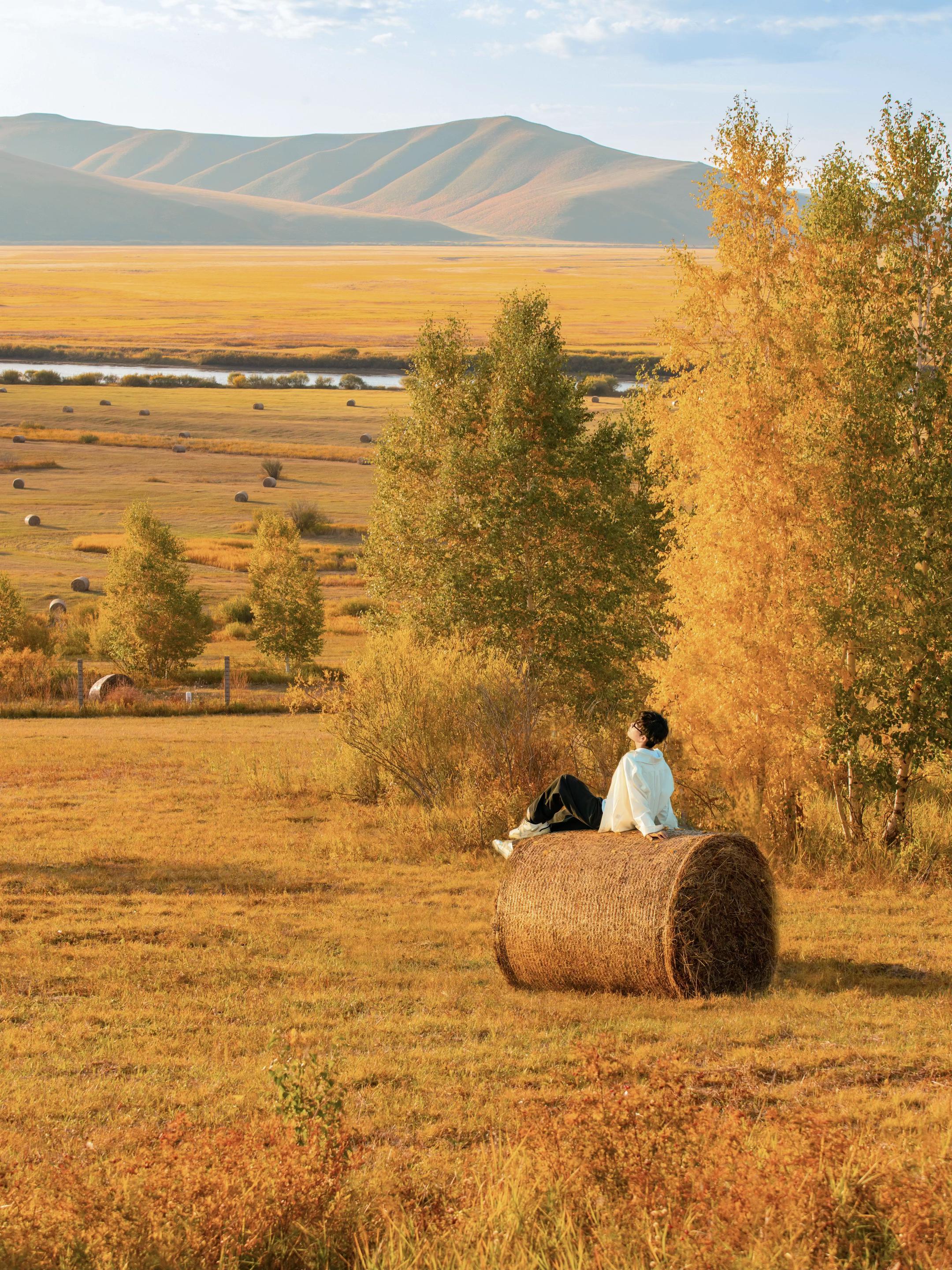 金黄的白桦林、开阔的草原、悠闲的牛羊