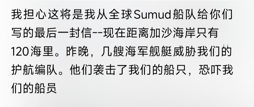 来自全球坚韧船队船员的最新消息 船队目前距离加沙120海里 在昨晚遭到威胁和袭击 意大利已撤出护航编队 其他成员表示,不会退缩 对于被围困的人们来说 每一分钟都很重要 继续抵制,向领导人施压 利用这支船队力求结束战争 加沙 加沙现状