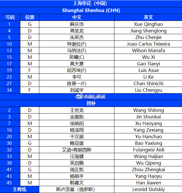 亚冠精英联赛上海申花vs蔚山HD首发名单已经出炉。