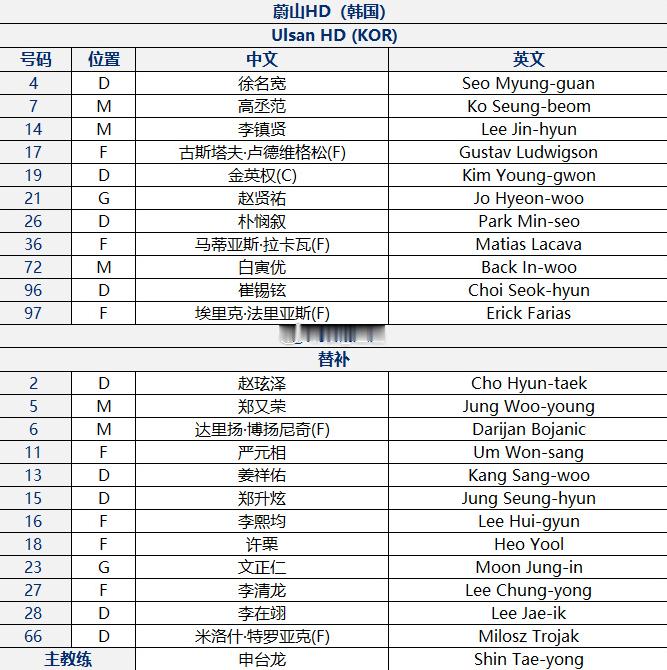 蔚山HD替补:23-文正仁、2-赵孩泽、5-郑又荣、6-达里扬·博扬尼奇、11-严元相、13-姜祥佑、15-郑升炫、16-李熙均、18-许栗、27-李清龙、28-李在翊、66-米洛什·特罗亚克