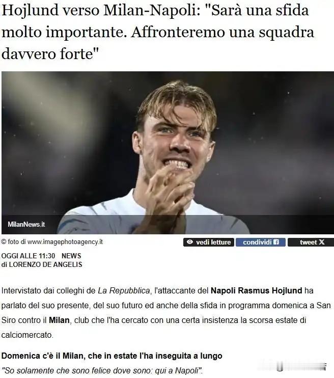 曼联前锋霍伊伦德谈到加盟米兰问题,霍伊伦德说我只能说我在那不勒斯过的十分开心。我