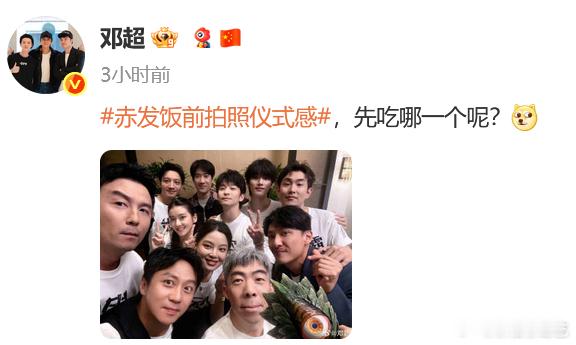 邓超先拍为敬 邓超赤发吃饭前也要拍照,这个吃饭前的仪式感也是get到了呀,可见《刺杀小说家2》剧组的小伙伴的友情很好! 邓超赤发吃饭前也要拍照